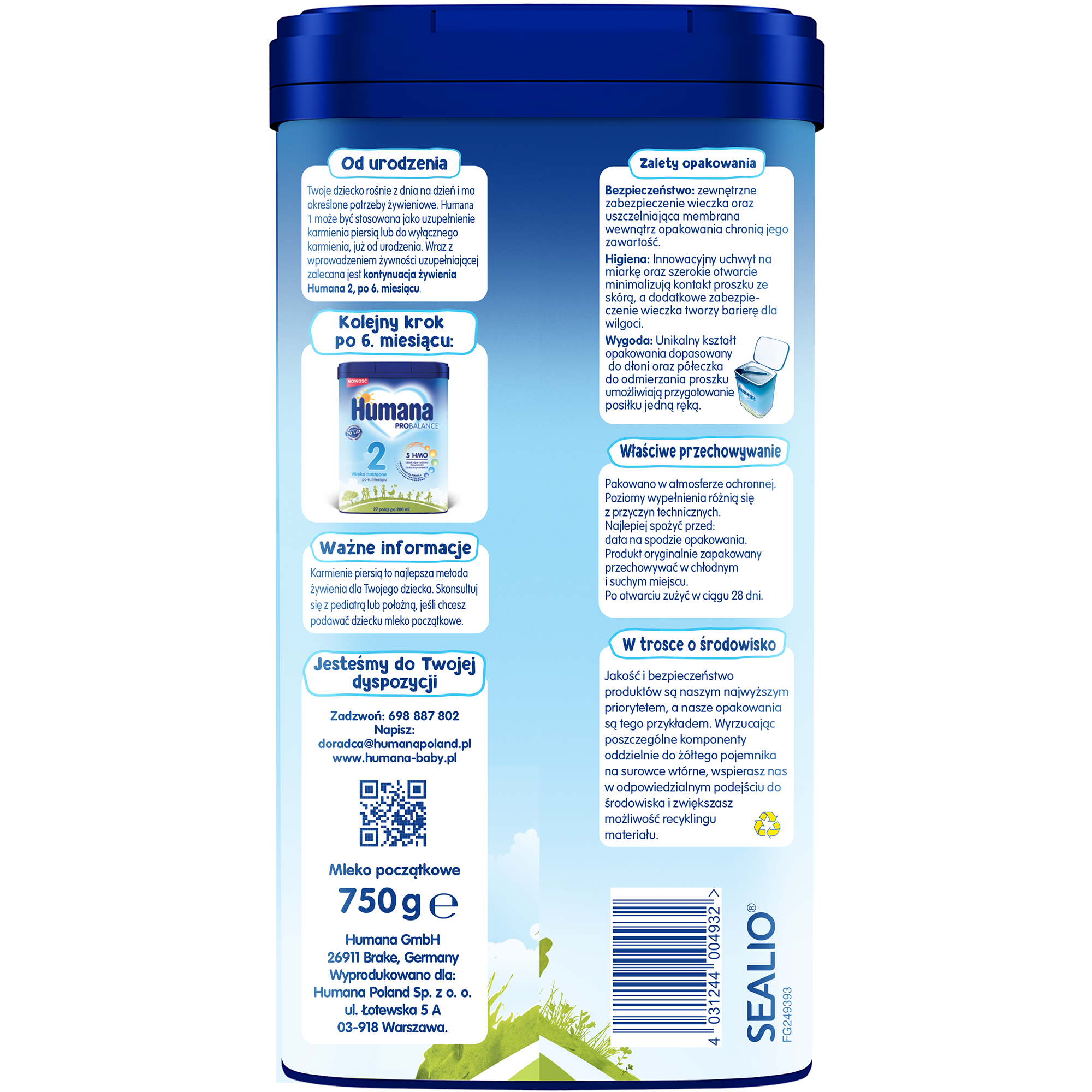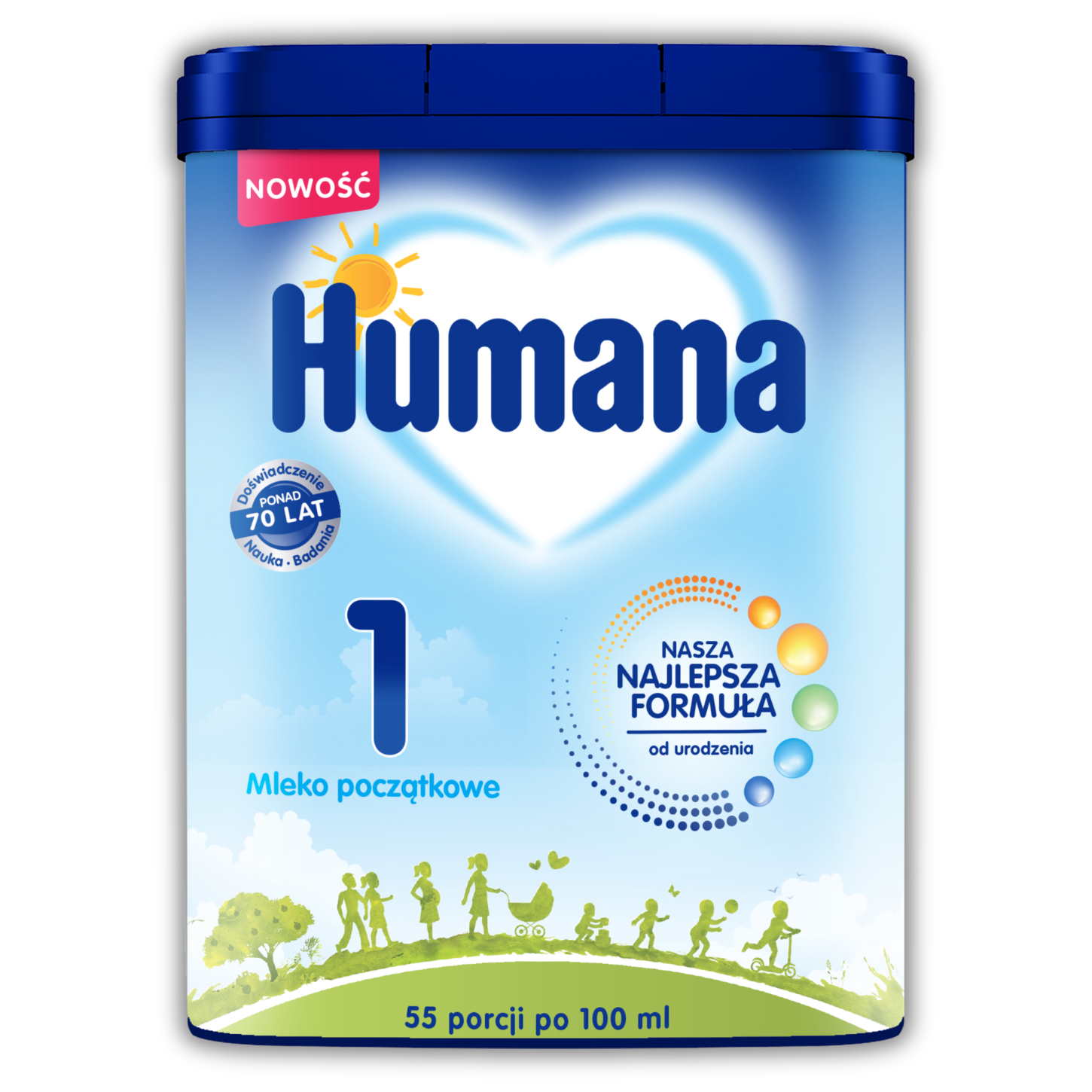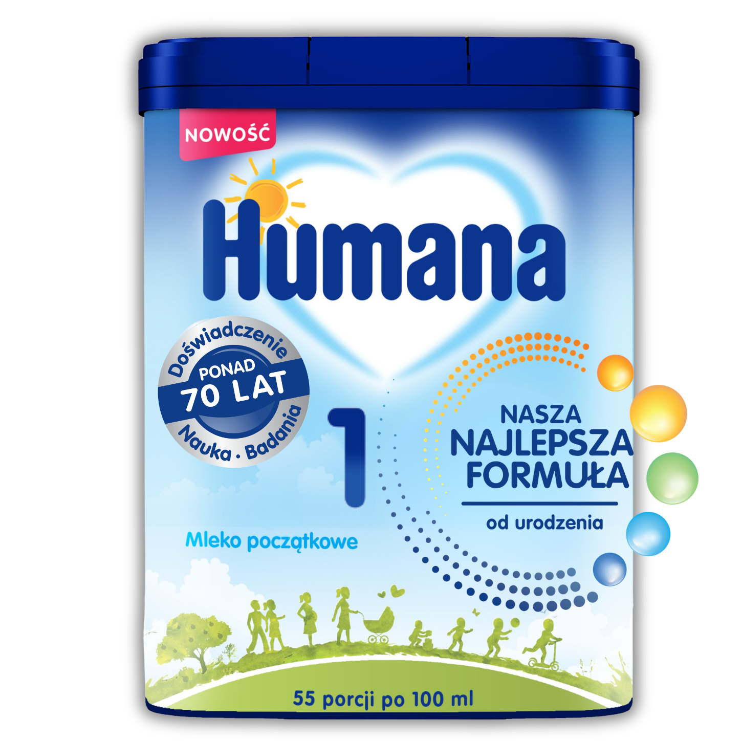 Humana 1 jest mlekiem początkowym do stosowania od urodzenia i jest przeznaczona dla niemowląt, które nie są karmione piersią lub potrzebują dokarmiania. Jedno opakowanie wystarcza na około 55 porcji po 100 ml.