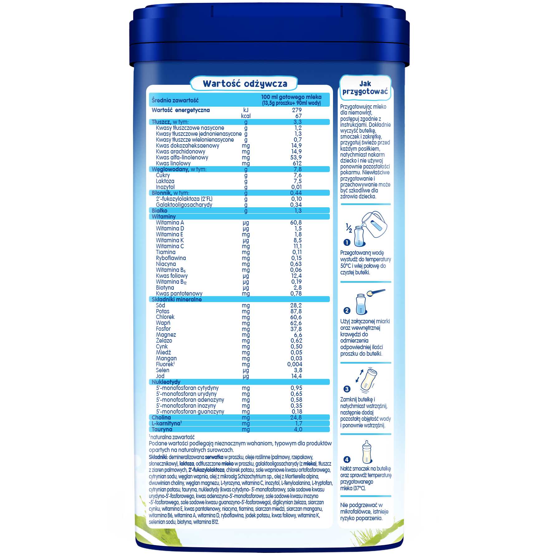 Średnia zawartość w 100 ml gotowego mleka (13,5 g proszku + 90 ml wody): wartość energetyczna 279 kJ / 67 kcal; tłuszcz 3,3 g (w tym nasycone 1,2 g, jednonienasycone 1,3 g, wielonienasycone 0,7 g); DHA 14,9 mg, ARA 14,9 mg, kwas alfa-linolenowy 53,9 mg, kwas linolowy 612 mg; węglowodany 7,8 g (w tym cukry 7,6 g, laktoza 7,5 g); inozytol 0,01 g; błonnik 0,44 g (2’FL 0,10 g, GOS 0,34 g); białko 1,3 g; witaminy: A 60,8 µg, D 1,5 µg, E 1,8 mg, K 8,5 µg, C 11,1 mg, tiaminy 0,11 mg, ryboflawiny 0,15 mg, niacyny 0,63 mg, B6 0,06 mg, kwas foliowy 12,4 µg, B12 0,19 µg, biotyna 2,8 µg, kwas pantotenowy 0,78 mg; składniki mineralne: sód 28,2 mg, potas 87,8 mg, chlorek 60,6 mg, wapń 62,6 mg, fosfor 37,8 mg, magnez 6,6 mg, żelazo 0,62 mg, cynk 0,50 mg, miedź 0,05 mg, mangan 0,03 mg, fluorek 0,004 mg, selen 3,8 µg, jod 14,4 µg; nukleotydy: CMP 0,95 mg, UMP 0,65 mg, AMP 0,58 mg, IMP 0,35 mg, GMP 0,18 mg; cholina 24,8 mg, L-karnityna 1,7 mg, tauryna 4,0 mg.