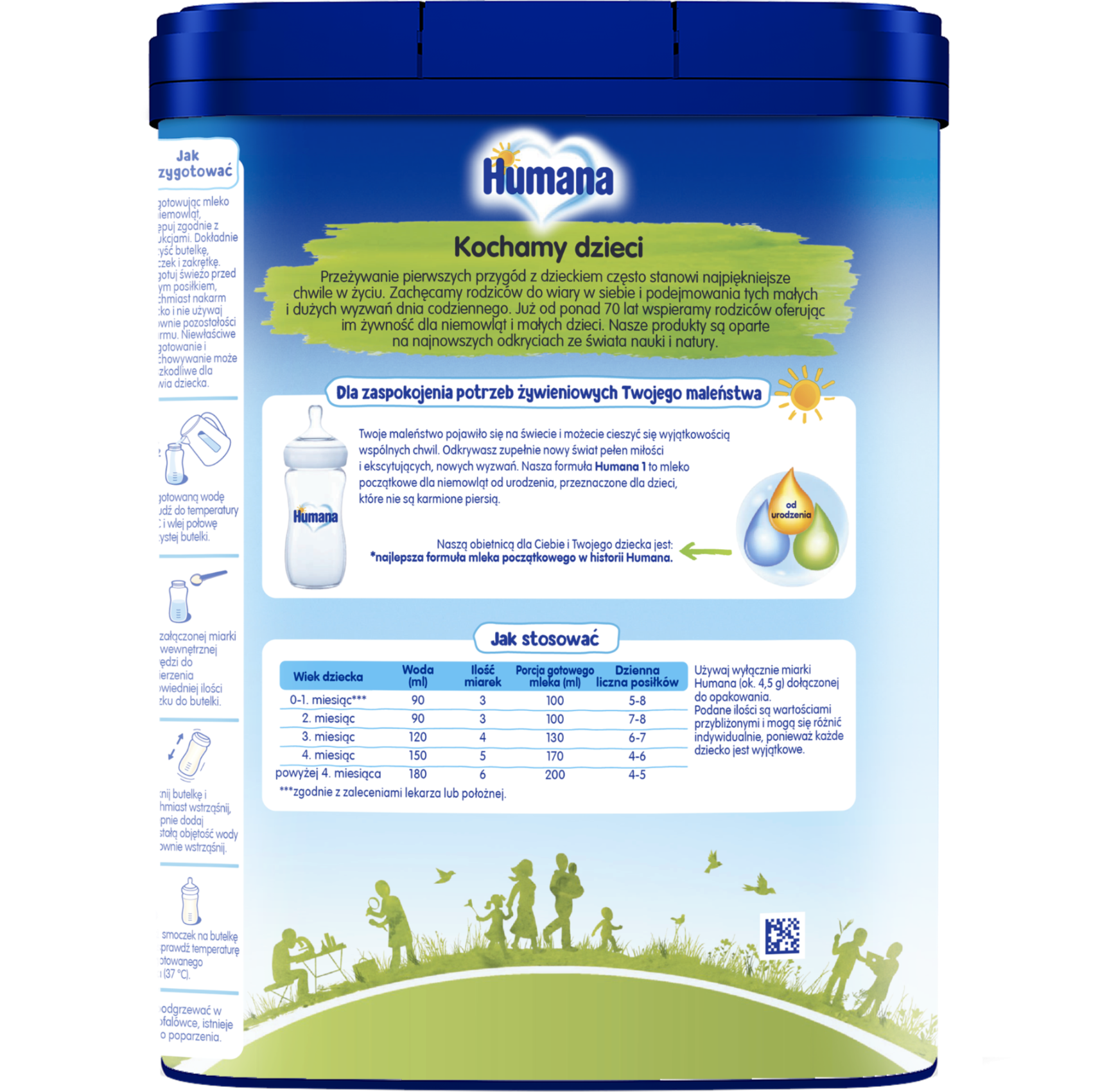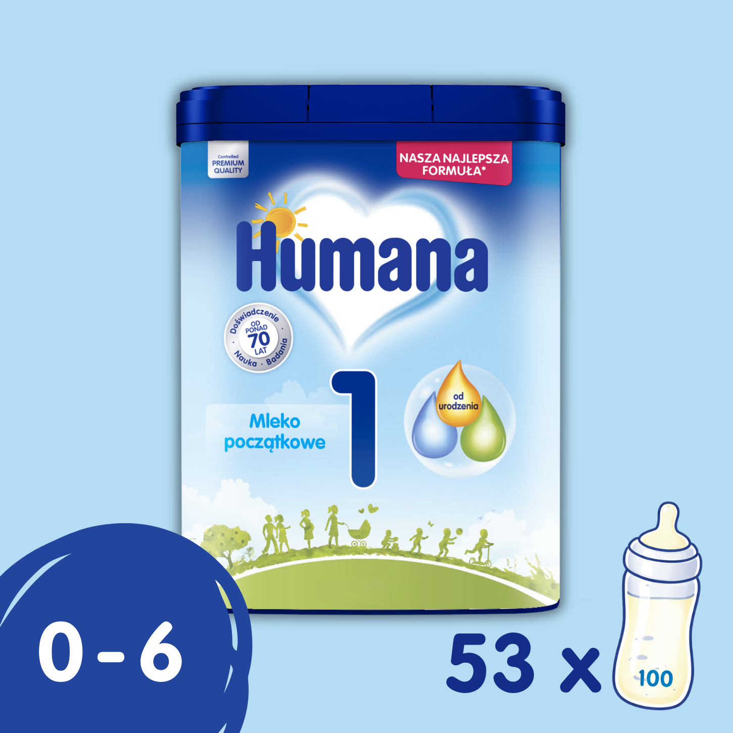 Twoje dziecko rośnie z dnia na dzień i ma określone potrzeby żywieniowe. Humana 1 może być stosowana jako uzupełnienie dla karmienia piersią lub do wyłącznego karmienia już od urodzenia. Jedno opakowanie wystarcza na około 53 porcje po 100 ml.