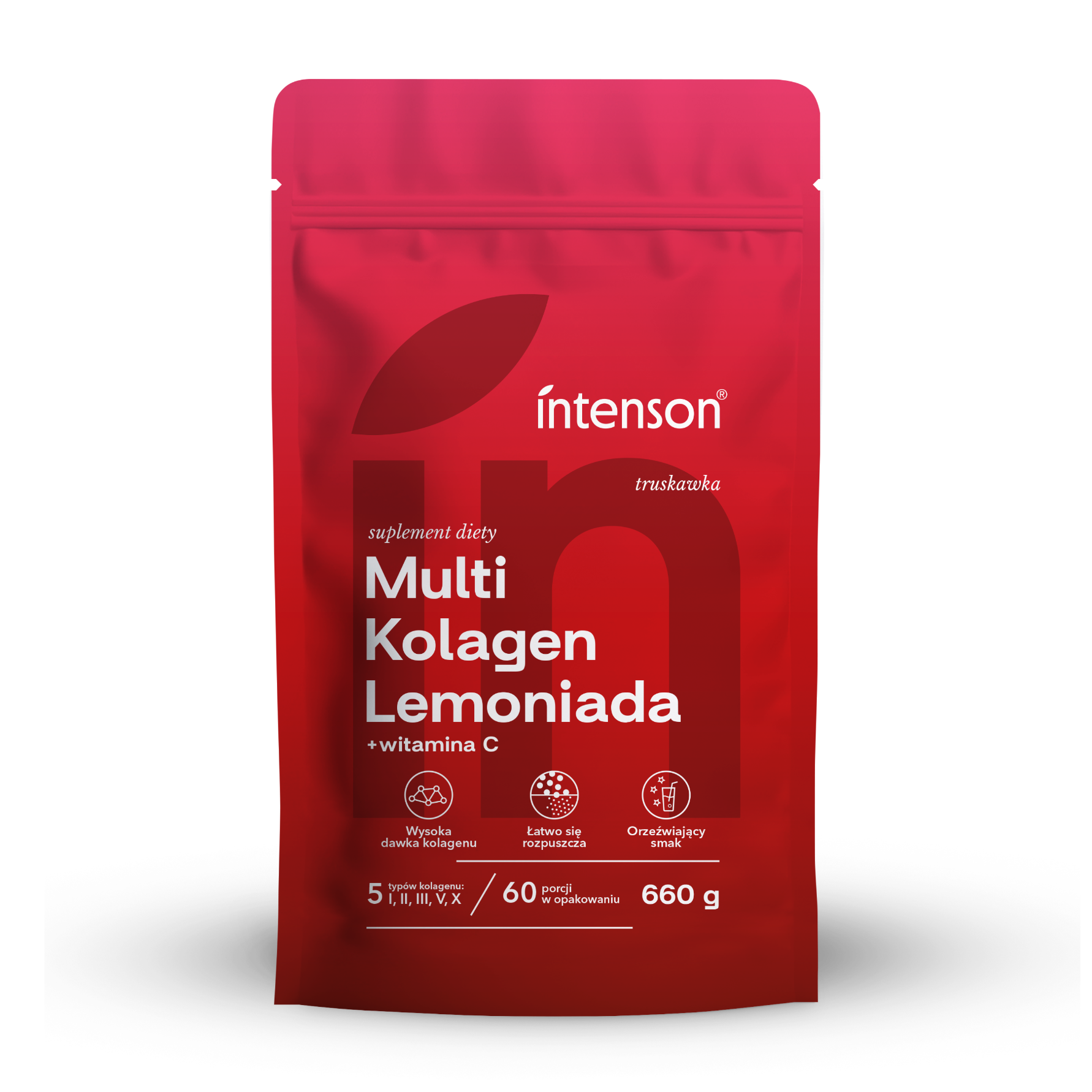 Suplement diety Intenson Multikolagen Limonada to hydrolizowany kolagen składający się z 5 typów kolagenu: I, II, III, V, X w formie proszku o orzeźwiającym smaku lemoniady truskawkowej. Bez dodatku cukru, słodzony erytrytolem i aromatyzowany naturalnie. Idealny jako dodatek do codziennej, zbilansowanej diety osób aktywnych. Kolagenowa lemoniada – codzienny rytuał piękna i świeżości. Połączenie 5 typów kolagenu w lekkiej, orzeźwiającej formule, która uzupełnia Twoją pielęgnację od wewnątrz.