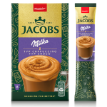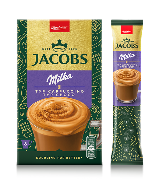 Jacobs Cappuccino Choco Milka to unikalne kremowe Cappuccino o smaku czekolady Milka. Jest to idealne połączenie dla smakoszy kawy i wielbicieli czekolady. Dodatkowo, Jacobs Cappuccino Choco Milka świetnie sprawdzi się na co dzień dla tych, którzy cenią sobie wygodę i delikatny smak kawy z dodatkiem smakowym lub jako substytut deseru.