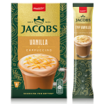 Jacobs Cappuccino Vanilla to wyjątkowe połączenie kawy rozpuszczalnej Jacobs oraz delikatnego smaku wanilii. Jacobs Cappuccino Vanilla świetnie sprawdzi się na co dzień dla tych, którzy cenią sobie wygodę i delikatny smak kawy z dodatkiem smakowym lub jako substytut deseru.