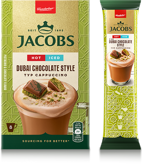 Jacobs Dubai Chocolate Style Cappuccino to wyjątkowa kompozycja, która łączy smak czekolady i pistacji. Idealne dla tych, którzy cenią sobie wygodę i nietuzinkowe połączenia smakowe – zarówno jako pyszna alternatywa dla deseru, jak i przerwa od codzienności. Jacobs Dubai Chocolate Style Cappuccino to zaproszenie do wyjątkowej podróży smaków – bez wychodzenia z domu.
