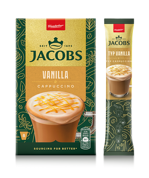 Jacobs Cappuccino Vanilla to wyjątkowe połączenie kawy rozpuszczalnej Jacobs oraz delikatnego smaku wanilii. Jacobs Cappuccino Vanilla świetnie sprawdzi się na co dzień dla tych, którzy cenią sobie wygodę i delikatny smak kawy z dodatkiem smakowym lub jako substytut deseru.