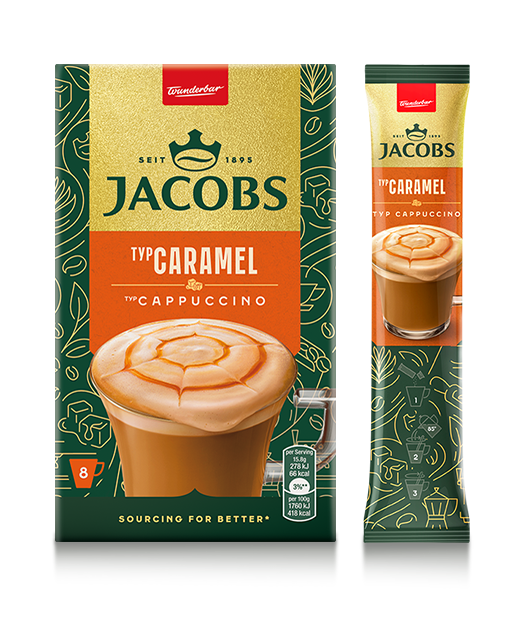 Jacobs Cappuccino Caramel to wyjątkowe połączenie kawy rozpuszczalnej Jacobs oraz delikatnego smaku karmelu. Jacobs Cappuccino Vanilla świetnie sprawdzi się na co dzień dla tych, którzy cenią sobie wygodę i delikatny smak kawy z dodatkiem smakowym lub jako substytut deseru.