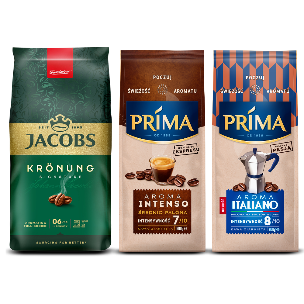 Kawa ziarnista Jacobs Krönung 1kg + Prima Aroma Italiano 900g + Prima Aroma Intenso 900g