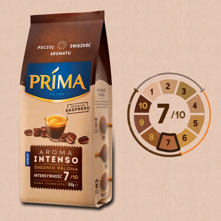 Prima Aroma Intenso to kompozycja wysokiej jakości ziaren Arabica i Robusta, idealna do ekspresu. Odpowiednio dobrany poziom palenia pozwala wydobyć z ziaren niepowtarzalny smak i aromat. Bogaty i wyrazisty smak Prima Aroma Intenso sprawi, że będzie ona ulubioną kawą miłośników klasycznych napojów kawowych i espresso.