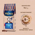 Prima Aroma Italiano to wysokiej jakości kawa ziarnista, palona w tradycyjnym włoskim stylu, aby podkreślić jej wyrazisty smak i aromat. Kompozycja starannie wyselekcjonowanych ziaren o dużej intensywności oferuje pełne, głębokie doznania smakowe w każdej filiżance. Świetnie sprawdza się w kawiarce, ale równie dobrze smakuje przygotowana innymi metodami parzenia.