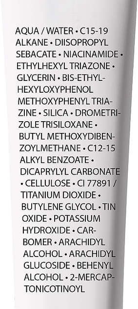 2039131 06 – INGREDIENTS: AQUA / WATER / EAU • C15-19 ALKANE • DIISOPROPYL SEBACATE • NIACINAMIDE • ETHYLHEXYL TRIAZONE • GLYCERIN • BIS-ETHYLHEXYLOXYPHENOL METHOXYPHENYL TRIAZINE • SILICA • DROMETRIZOLE TRISILOXANE • BUTYL METHOXYDIBENZOYLMETHANE • C12-15 ALKYL BENZOATE • DICAPRYLYL CARBONATE • CELLULOSE • CI 77891 / TITANIUM DIOXIDE • BUTYLENE GLYCOL • TIN OXIDE • POTASSIUM HYDROXIDE • CARBOMER • ARACHIDYL ALCOHOL • ARACHIDYL GLUCOSIDE • BEHENYL ALCOHOL • 2-MERCAPTONICOTINOYL GLYCINE • SODIUM DILAURAMIDOGLUTAMIDE LYSINE • SODIUM THIOSULFATE • AMMONIUM ACRYLOYLDIMETHYLTAURATE/VP COPOLYMER • HYDROXYACETOPHENONE • CAPRYLOYL SALICYLIC ACID • CAPRYLYL GLYCOL • CITRIC ACID • TRISODIUM ETHYLENEDIAMINE DISUCCINATE • XANTHAN GUM • PENTYLENE GLYCOL • POLY C10-30 ALKYL ACRYLATE • POLYGLYCERYL-2 LAURATE • TOCOPHEROL • PENTAERYTHRITYL TETRA-DI-T-BUTYL HYDROXYHYDROCINNAMATE • PHENOXYETHANOL • MICA • CI 14700 / RED 4 • PARFUM / FRAGRANCE (F.I.L. N70034093/1).