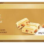 Biała czekolada z całymi migdałami (12%) oraz kruszonymi migdałami (5%)