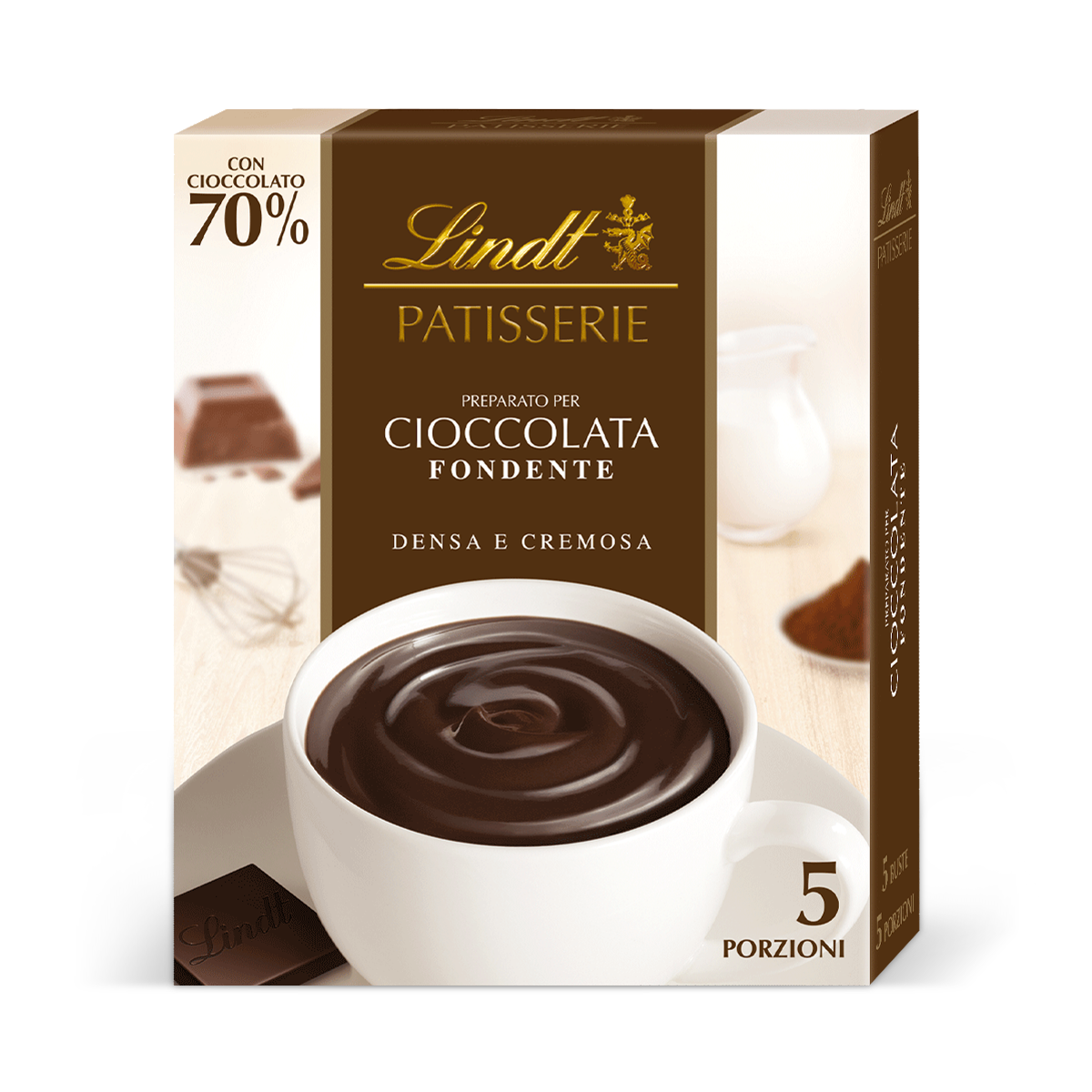Napój czekoladowy w proszku o smaku czekolady gorzkiej, do picia na gorąco, 5 saszetek w środku.