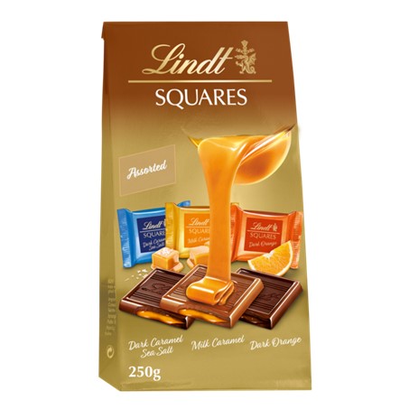 Usiądź wygodnie i ciesz się asortymentem najlepszych czekoladek w kształcie kwadratów Lindt: mleczne z nadzieniem karmelowym, gorzkie z nadzieniem pomarańczowym oraz gorzkie z nadzieniem karmelowym i solą morską.