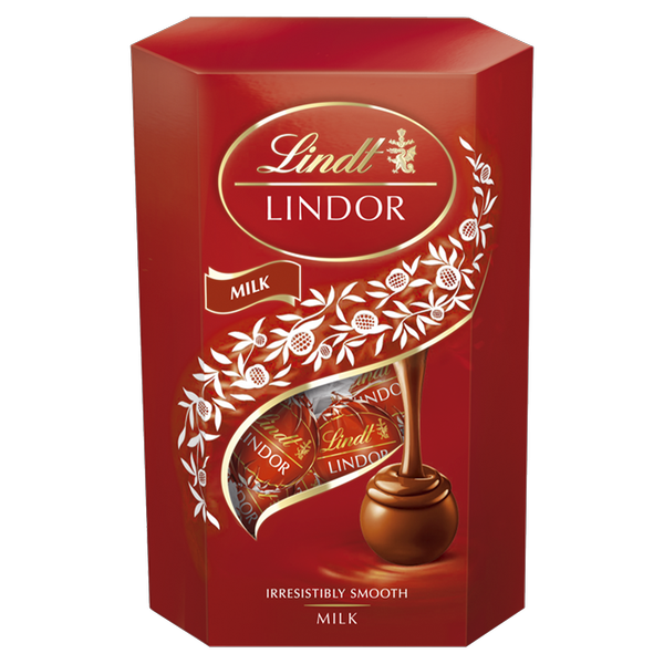 Pralinki z czekolady mlecznej z delikatnie rozpływającym się nadzieniem (44%). Lindt LINDOR Milk to praliny z czekolady mlecznej, rozpływające się w ustach, ze zniewalająco aksamitnym nadzieniem w otoczce z mlecznej czekolady.