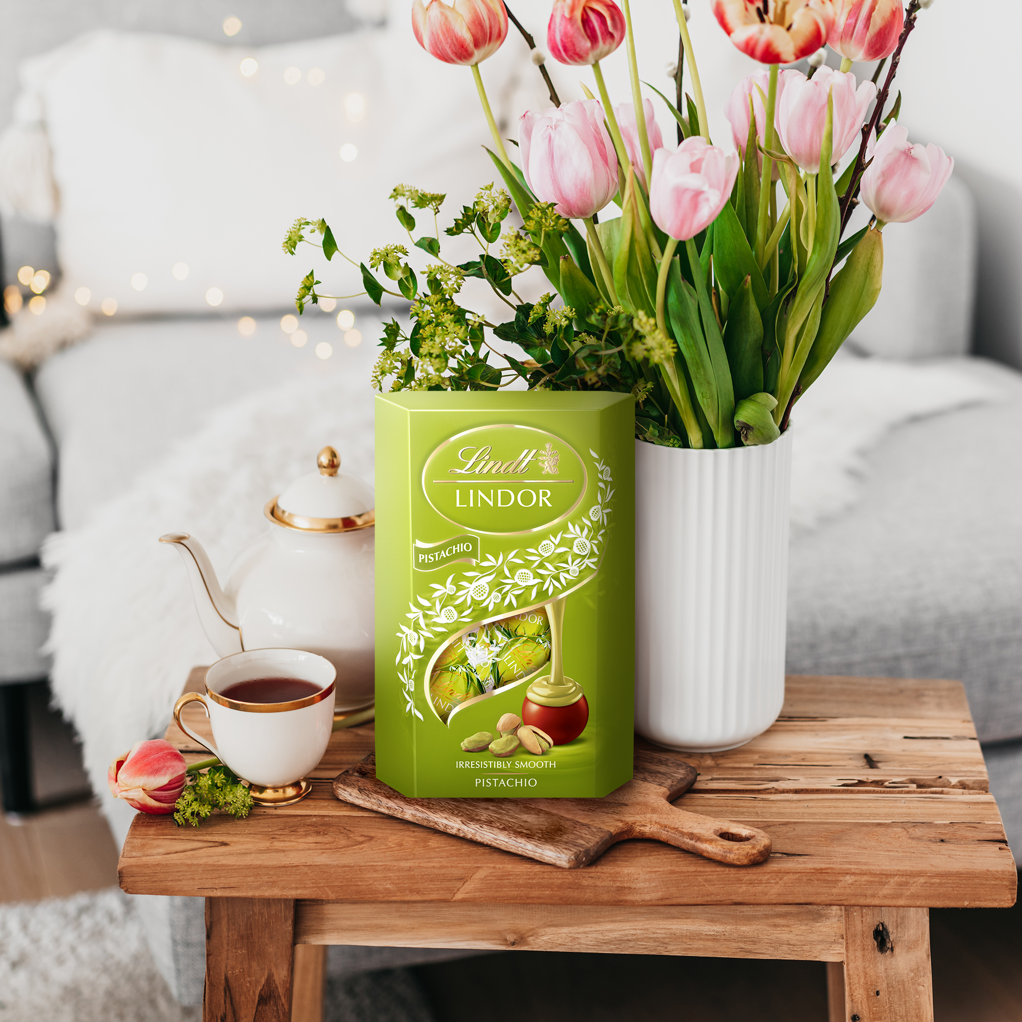 Pralinki z czekolady mlecznej z delikatnie rozpływającym się nadzieniem pistacjowym (44%). Lindt LINDOR Pistachio to praliny, rozpływające się w ustach, ze zniewalająco aksamitnym nadzieniem pistacjowym w otoczce z mlecznej czekolady