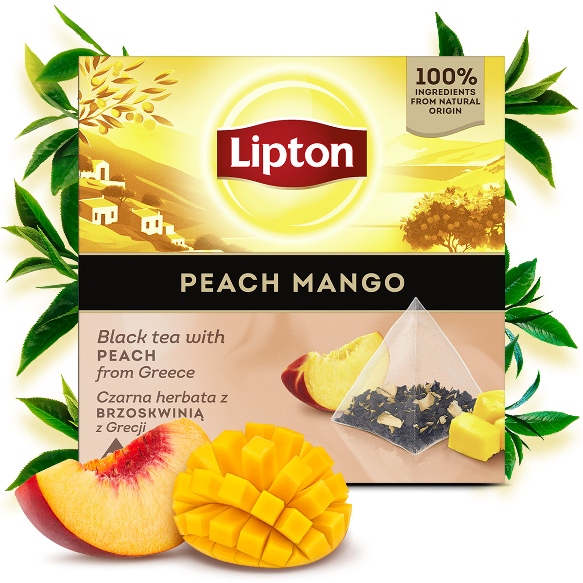 Kawałki soczystego mango i brzoskwiń z Grecji otulone najwyższej jakości listkami czarnej herbaty ze zrównoważonych upraw Lipton.