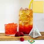 2. Przygotuj szklankę: dodaj 8 malin i rozgnieć tłuczkiem, dodaj topiokę, lód i sok z cytryny. Dodaj zaparzoną herbatę i dopełnij wodą gazowaną