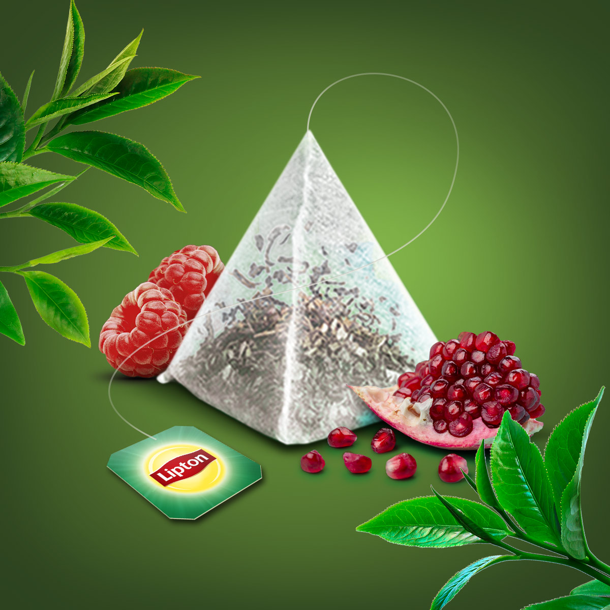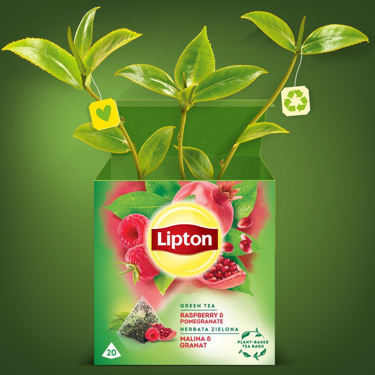 Łagodna zielona herbata z dodatkiem malin i granatu, zamknięta w torebkach piramidkach.