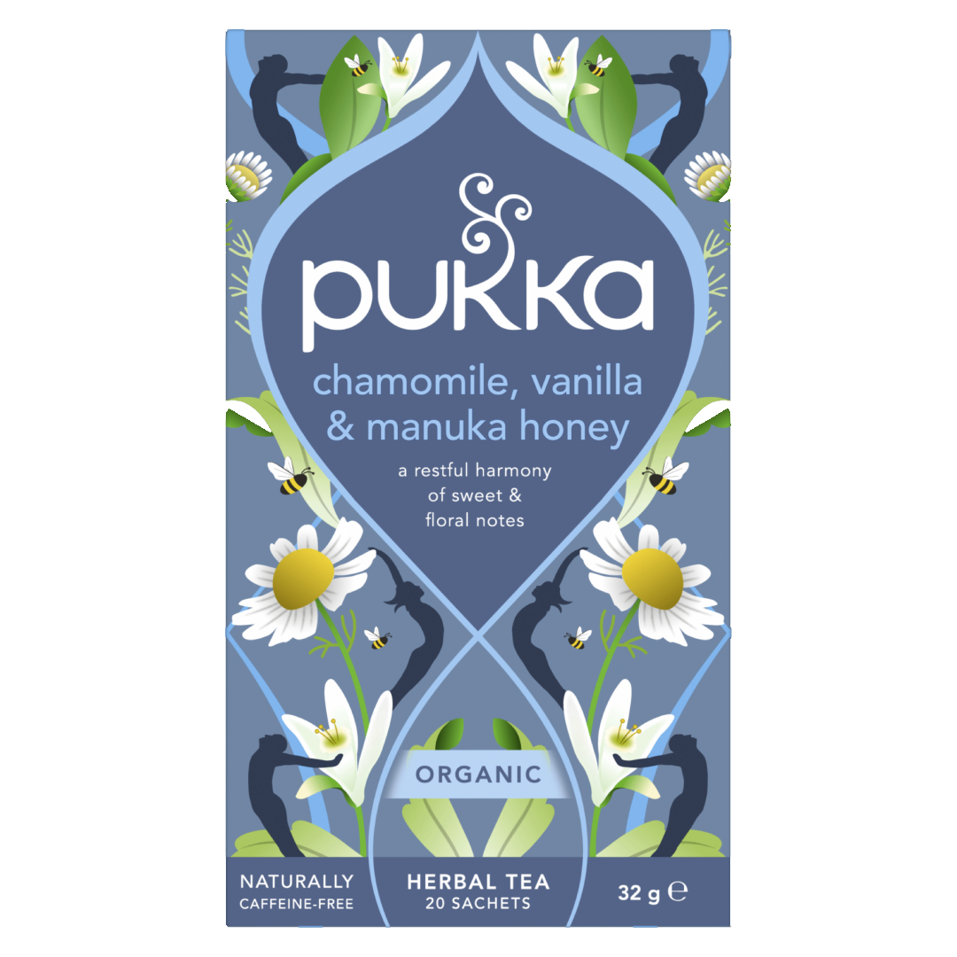 Mieszanka Organicznej herbatki Pukka Chamomile, Vanilla & Manuka Honey to doskonałe odprężenie i relaks w wybranej przez Ciebie formie. Sercem ekologicznej herbaty Pukka jest rumianek, laska wanilii oraz słodki miód manuka ze starannie wyselekcjonowanych składników, pochodzących wyłącznie z odpowiedzialnych źródeł – to niezwykłe połączenie zostało zamknięte w małych torebkach.