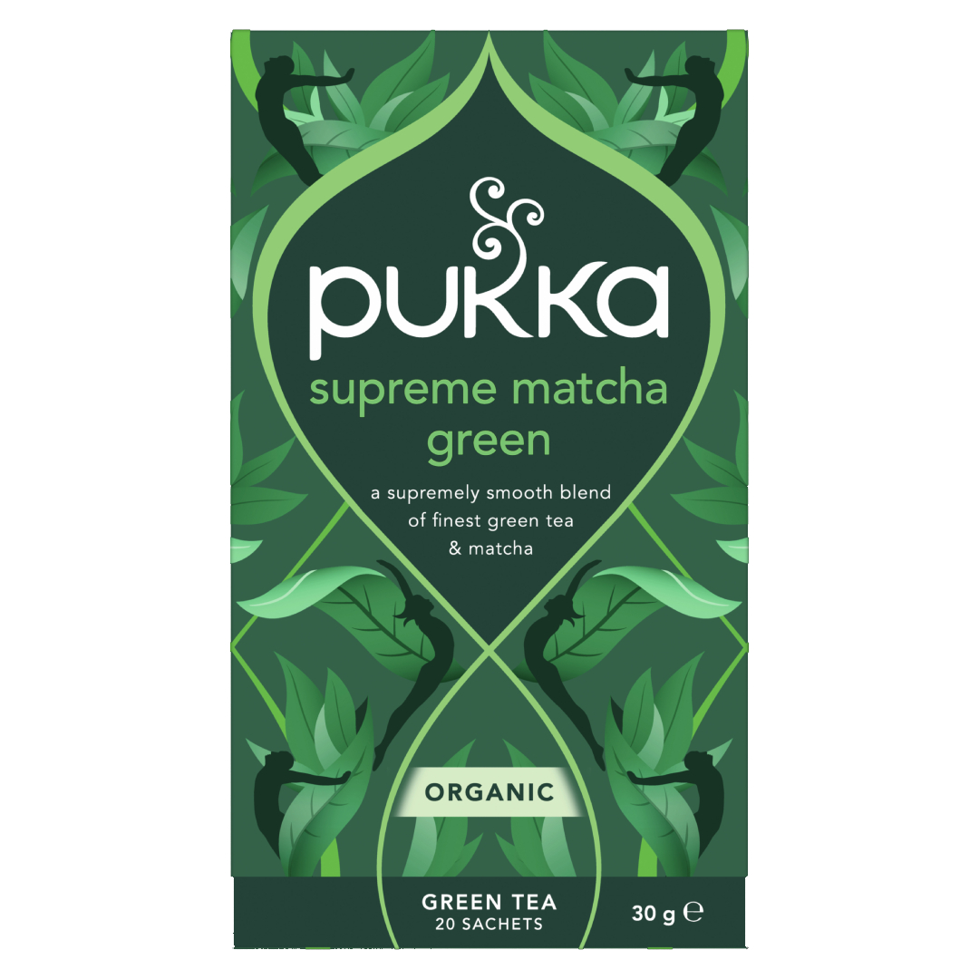 Pukka Supreme Matcha Green to unikalna kompozycja, która łączy w sobie właściwości zielonej herbaty i dobroczynne działanie Matchy. Starannie stworzona mieszanka skrywa w sobie trzy rodzaje zielonej herbaty, są to: chińska herbata Snacha, indyjska herbata Oothu, wietnamska Suoi Gang. Składniki ekologicznej zielonej herbatki Pukka to doskonałe źródło naturalnej energii. Skosztuj zielonej herbaty Pukka Supreme Matcha Green i poczuj, jak Twoje ciało na nowo wypełnia witalność – wystarczy jeden łyk!