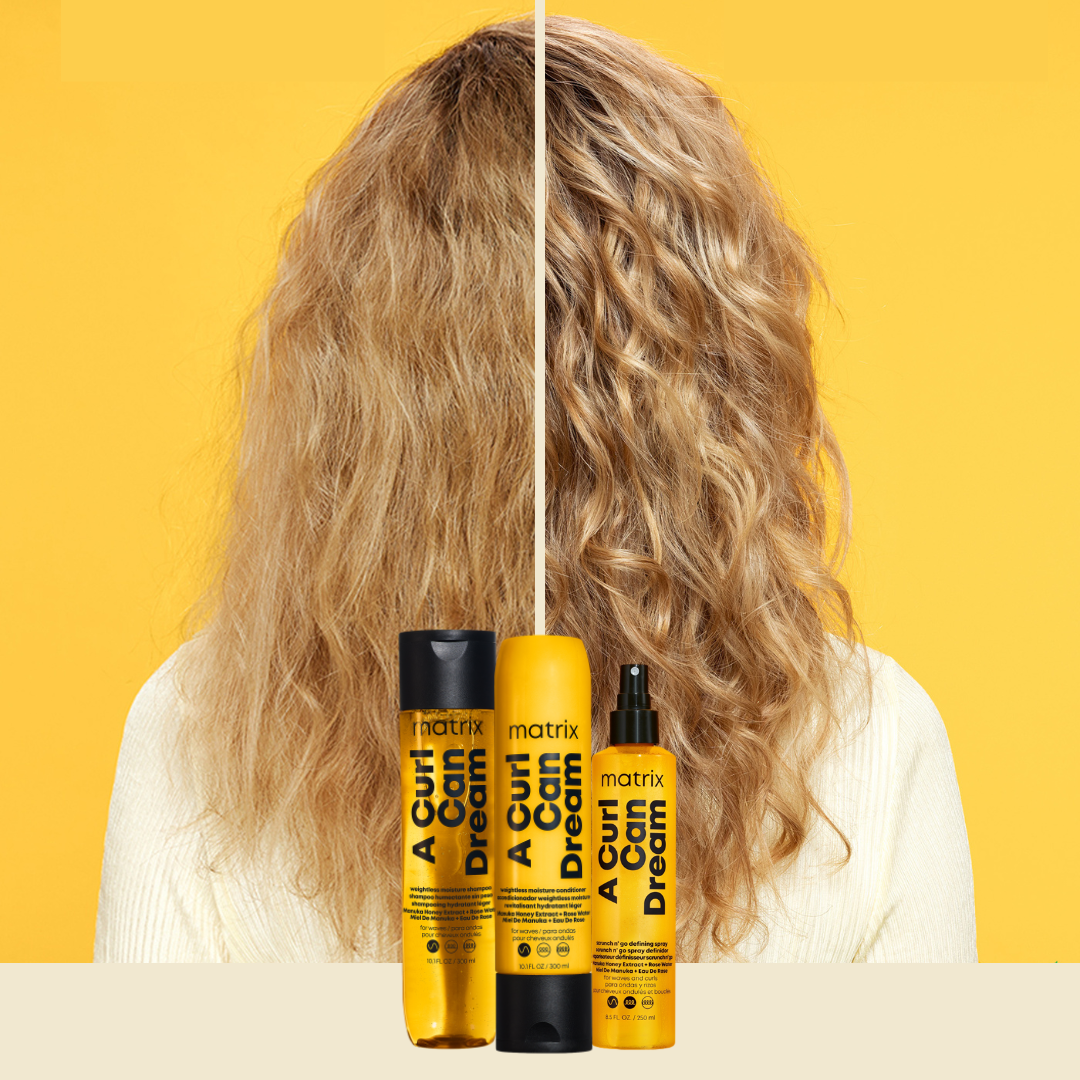 Efekt osiągnięty przy zastosowaniu systemu A Curl Can Dream, linii do włosów falowanych, składącego się z szamponu, odżywki i spray’u.