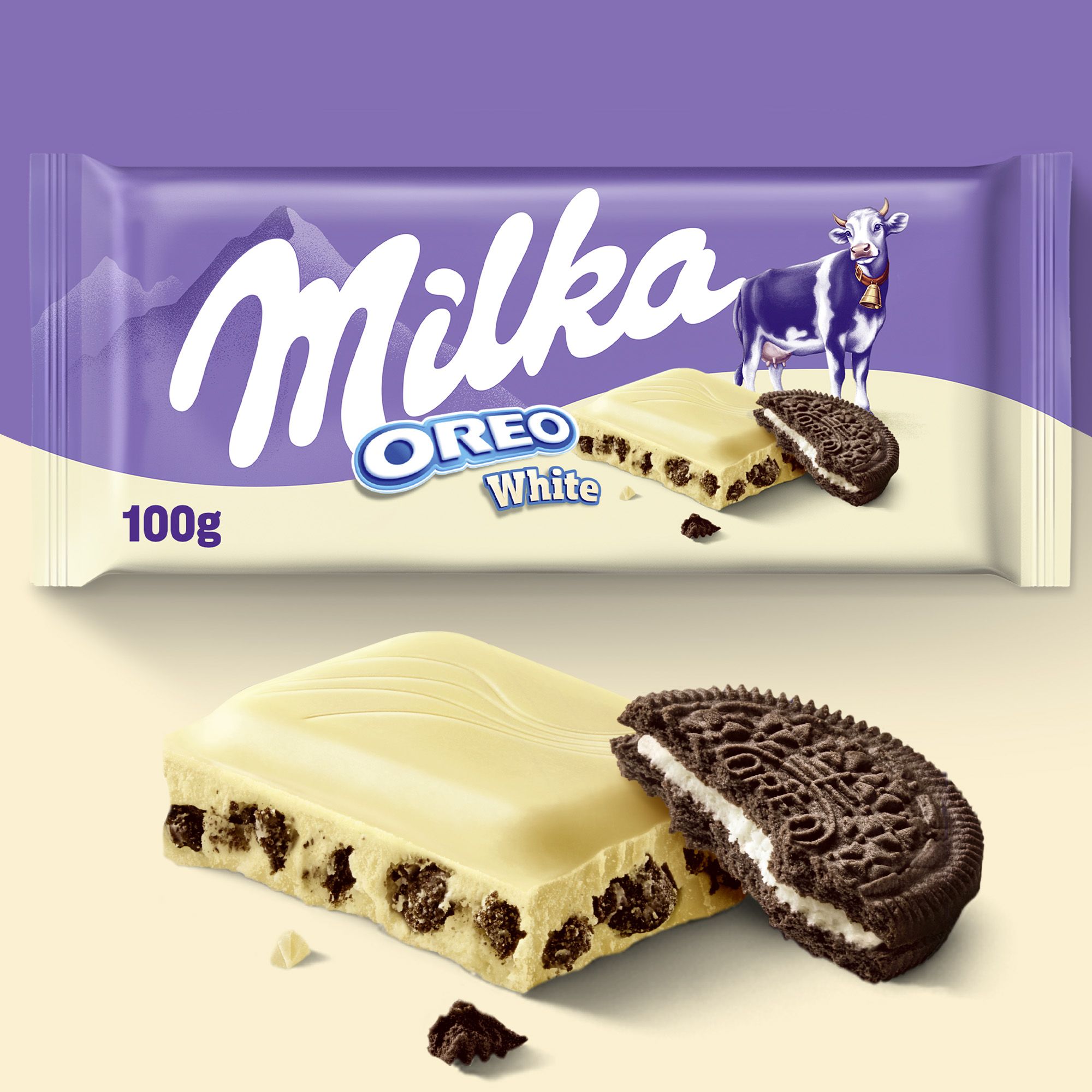 Delikatna, biała czekolada Milka z alpejskiego mleka oraz ulubione ciasteczka Oreo i mleczne nadzienie o smaku waniliowym ukryte w jej wnętrzu.