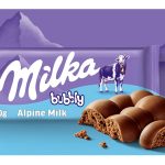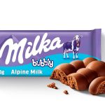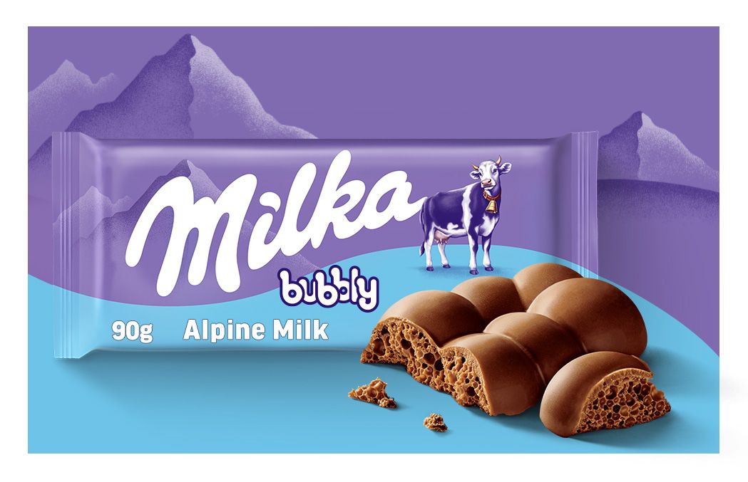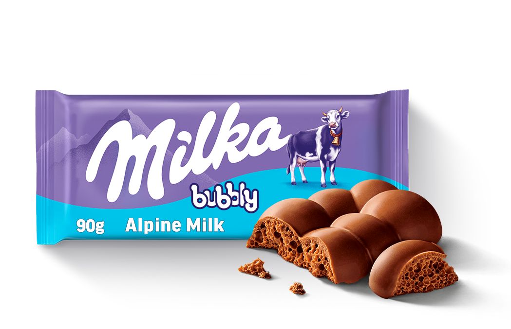 Milka Bubbly to to delikatna, mleczna czekolada z alpejskiego mleka stworzona w formie unikalnej tabliczki, w której standardowe kostki zostały zamienione w okrągłe bąbelki – dzięki temu tabliczka Milka Bubbly posiada bąbelki zarówno w środku, jak i na zewnątrz.