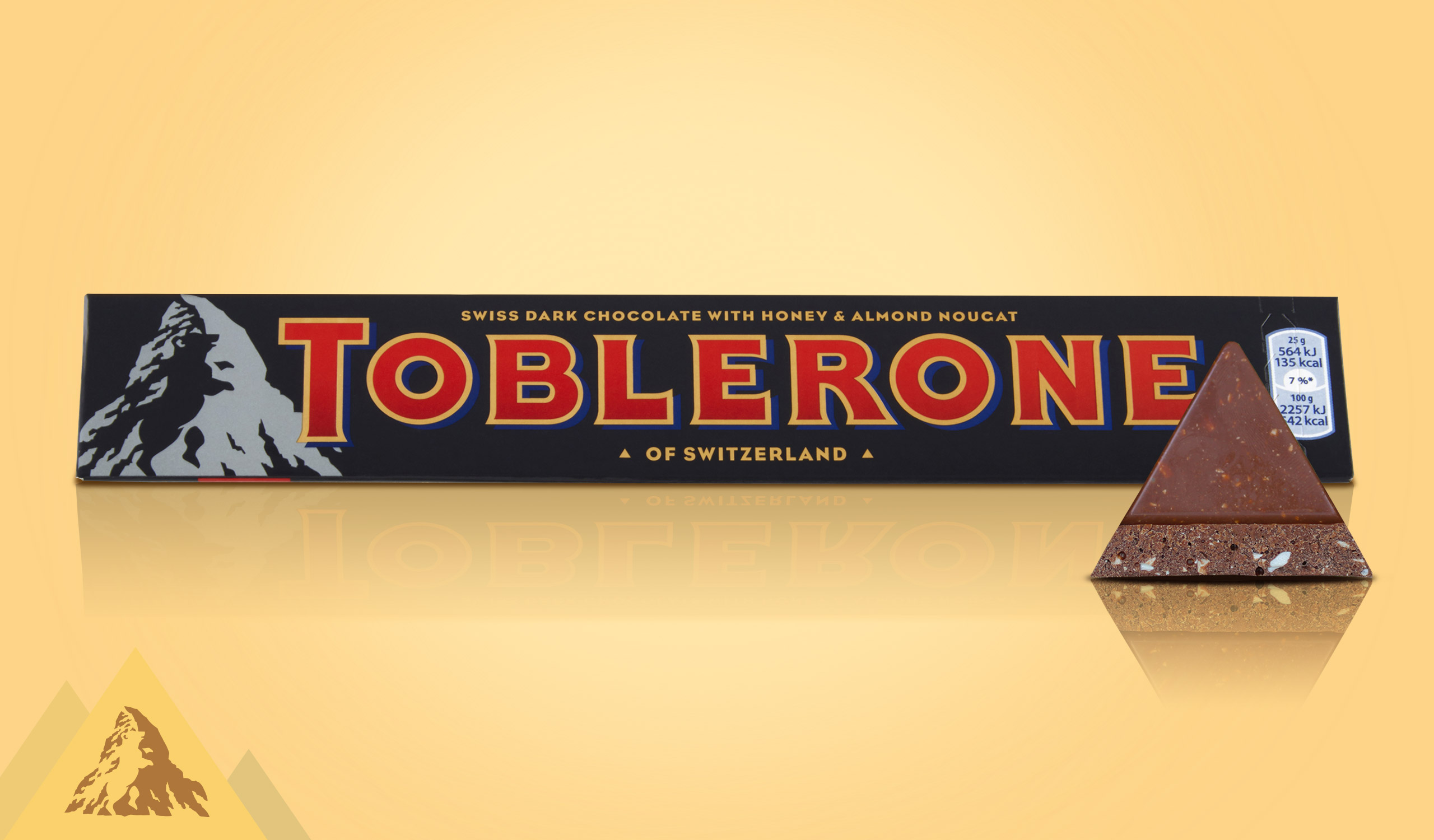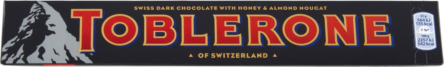 Toblerone ciemne to unikatowa, trójkątna, szwajcarska czekolada znana od 1908 r. Jej niezwykła receptura pochodzi ze szwajcarskiego Bern, w którym Toblerone jest produkowane niezmiennie od ponad 100 lat. Wyjątkowość tej tabliczki polega nie tylko na jej trójkątnym kształcie, ale i na oryginalnym połączeniu ciemnej czekolady, miodu i nugatu. Ta unikalna receptura sprawia, iż ciemne Toblerone ma tak niepowtarzany i bogaty smak.