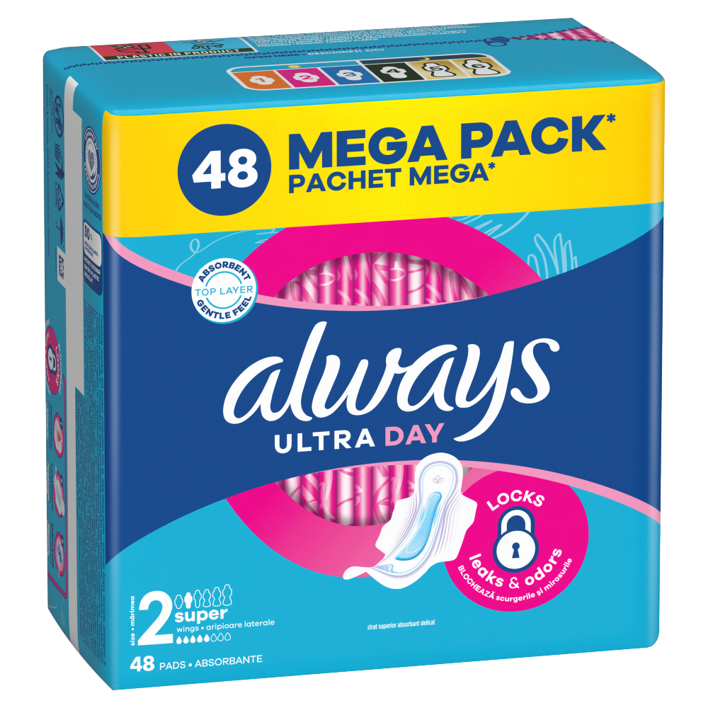 Wybierz odpowiednie rozwiązanie dla siebie, takie jak potrójna ochrona, którą zapewniają podpaski ALWAYS Ultra Day Super (rozmiar 2) ze skrzydełkami. Podpaski Always z chłonną i delikatną powłoczką wchłaniają wilgoć w kilka sekund dzięki technologii InstantDry, a za sprawą technologii LeakGuard i OdorLock zapobiegają przeciekaniu i nieprzyjemnemu zapachowi. Wyjątkowe skrzydełka ComfortLock zaprojektowano tak, by zapewnić doskonałe dopasowanie do każdego rodzaju bielizny.
