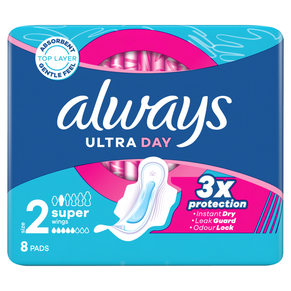Wybierz odpowiednie rozwiązanie dla siebie, takie jak potrójna ochrona, którą zapewniają podpaski ALWAYS Ultra Day Super rozmiar 2 ze skrzydełkami. Podpaski Always z chłonną i delikatną powłoczką wchłaniają wilgoć w kilka sekund dzięki technologii InstantDry, a za sprawą technologii LeakGuard i OdorLock zapobiegają przeciekaniu i nieprzyjemnemu zapachowi. Wyjątkowe skrzydełka ComfortLock zaprojektowano tak, by zapewnić doskonałe dopasowanie do każdego rodzaju bielizny. Podpaski Always zostały zatwierdzone dermatologicznie przez Skin Health Alliance.
