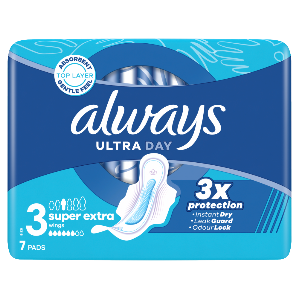Wybierz odpowiednie rozwiązanie dla siebie, takie jak potrójna ochrona, którą zapewniają podpaski ALWAYS Ultra Super Extra rozmiar 3. Podpaski Always z chłonną i delikatną powłoczką wchłaniają wilgoć w kilka sekund dzięki technologii InstantDry, a za sprawą technologii LeakGuard i OdorLock zapobiegają przeciekaniu i nieprzyjemnemu zapachowi. Wyjątkowe skrzydełka ComfortLock zaprojektowano tak, by zapewnić doskonałe dopasowanie do każdego rodzaju bielizny. Podpaski Always Ultra zostały zatwierdzone dermatologicznie przez Skin Health Alliance.