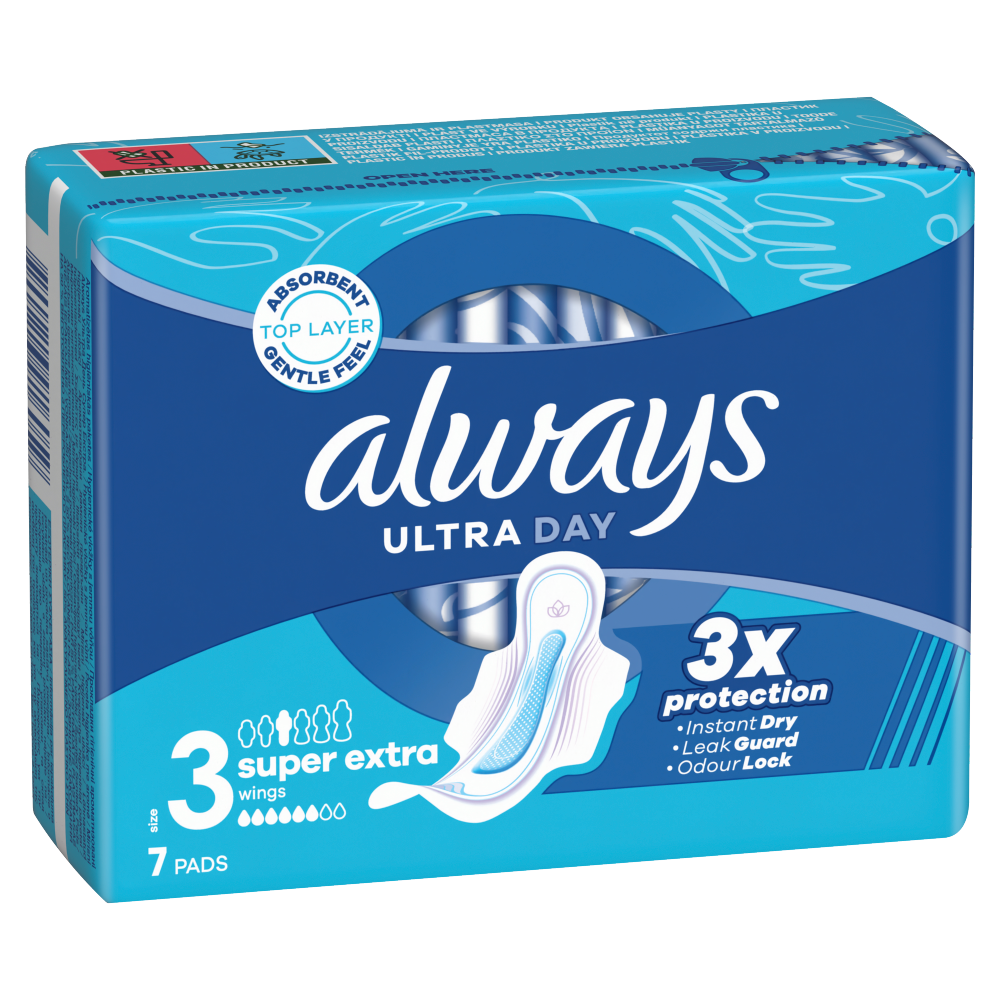 Wybierz odpowiednie rozwiązanie dla siebie, takie jak potrójna ochrona, którą zapewniają podpaski ALWAYS Ultra Super Extra rozmiar 3. Podpaski Always z chłonną i delikatną powłoczką wchłaniają wilgoć w kilka sekund dzięki technologii InstantDry, a za sprawą technologii LeakGuard i OdorLock zapobiegają przeciekaniu i nieprzyjemnemu zapachowi. Wyjątkowe skrzydełka ComfortLock zaprojektowano tak, by zapewnić doskonałe dopasowanie do każdego rodzaju bielizny. Podpaski Always Ultra zostały zatwierdzone dermatologicznie przez Skin Health Alliance.