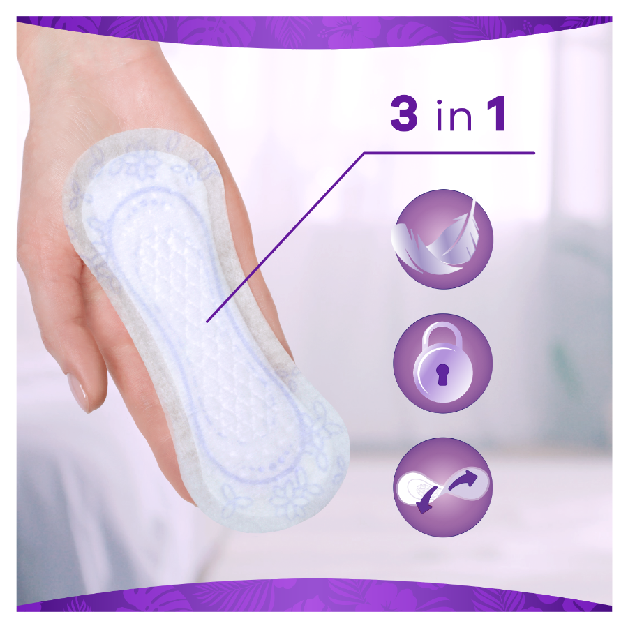 3 w 1: kontrola przykrych zapachów, komfort, suchość Dopasowują się tak, że nawet ich nie poczujesz Wkładki higieniczne z wkładem chłonnym pozwolą Ci czuć się pewnie przez cały dzień Technologia neutralizująca przykre zapachy zapewniająca uczucie świeżości i pewności siebie przez cały dzień Oddychający materiał Zatwierdzone przez dermatologów ze Skin Health Alliance Wkładki higieniczne przebadane dermatologicznie i delikatne dla skóry Opakowanie z certyfikatem FSC