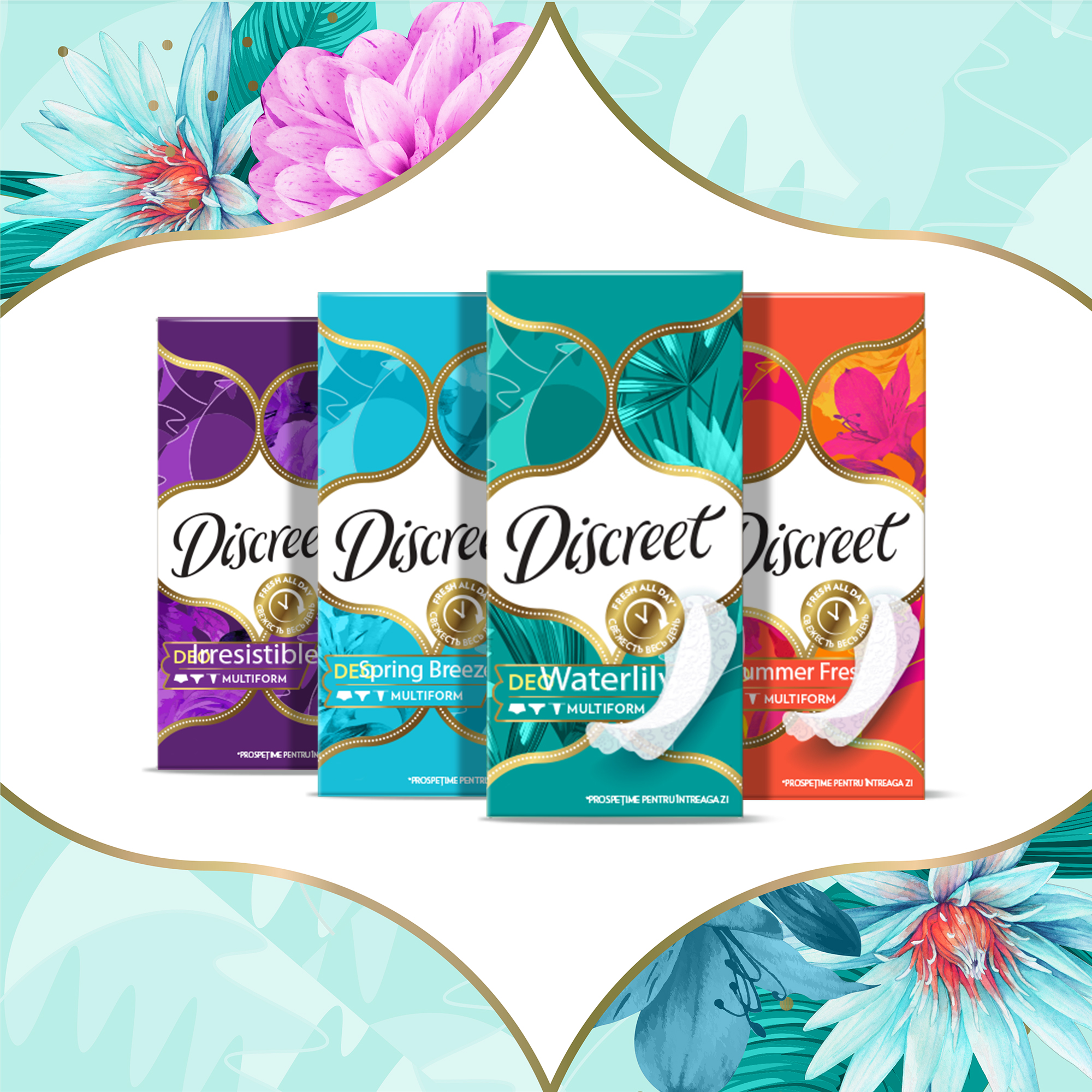 Wkładki higieniczne Discreet Multiform są dostępne o zapachu: Waterlily, Spring Breeze, Irresistible i Summer Fresh.