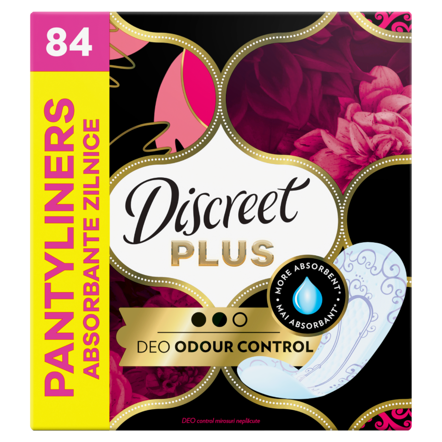 Discreet Plus ze specjalną technologią zapobiegającą przykrym zapachom neutralizuje nieprzyjemne zapachy, zapewniając cudowne uczucie świeżości.