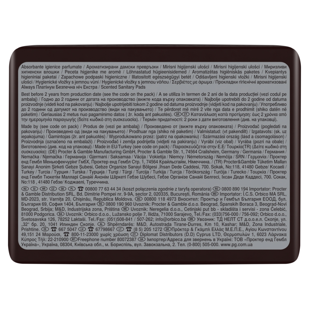 Podpaski Always Platinum zostały opracowane pod kątem lepszego dopasowania*, tak aby nie przeciekały, nie przesuwały się i nie powodowały dyskomfortu. Dzięki podpaskom higienicznym Always Platinum możesz spać spokojnie. Always Platinum Secure Night Extra (rozmiar 5) mają o 85%* większy tył, dzięki czemu zapewniają skuteczniejszą ochronę tam, gdzie potrzebujesz jej najbardziej. * w porównaniu z Always Platinum Normal (rozmiar 1)