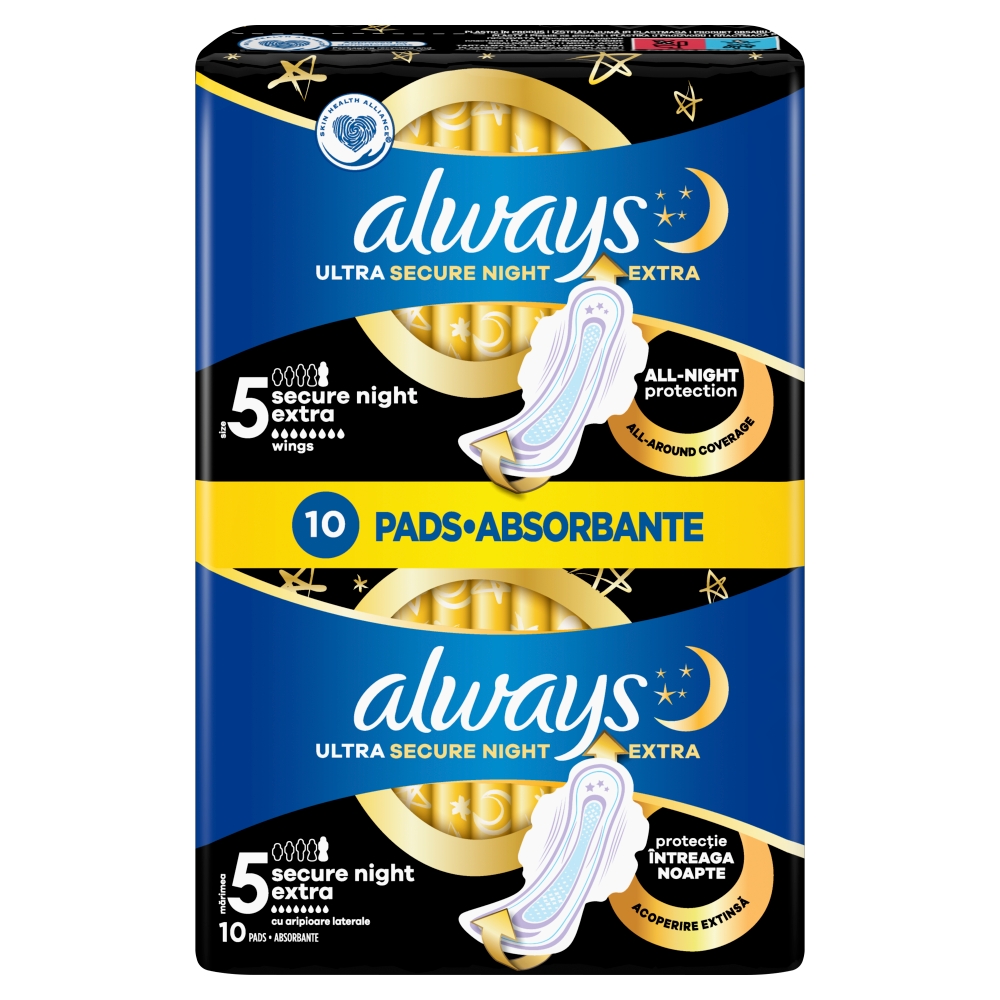Gwarancja nieprzerwanego snu dzięki podpaskom higienicznym ze skrzydełkami ALWAYS Ultra Secure Night Extra (rozmiar 5). Zaprojektowane z myślą o potrójnej ochronie, dzięki czemu nie musisz budzić się i sprawdzać, czy podpaska przeciekła, i zmieniać jej w środku nocy. O 9% większy przód i o 85% większy tył* w połączeniu z technologią LeakGuard zapewniają ochronę z każdej strony, zapobiegając przeciekaniu podczas nocnych krwawień. System InstantDry wchłania wilgoć w kilka sekund i utrzymuje ją z dala od Twojej skóry. Podpaski są wyposażone w technologię OdourLock, która neutralizuje przykre zapachy, dzięki czemu możesz czuć się świeżo i czysto. Śpij spokojnie dzięki potrójnej ochronie Always Ultra. Zatwierdzone dermatologicznie przez organizację Skin Health Alliance. Znajdź podpaskę idealnie dopasowaną do Twojego ciała dzięki Always My Fit, systemowi spersonalizowanego dobierania rozmiaru, który pomoże Ci znaleźć najlepsze zabezpieczenie oferowane przez markę Always w czasie okresu, zależnie od intensywności miesiączki i rozmiaru bielizny, jaki nosisz.