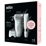 Depilator Braun Silk-épil 7 pozwala uzyskać i utrzymać gładką skórę nawet przez miesiąc. Wyposażony w szeroką głowicę depilator do stosowania na mokro i sucho usuwa włosy z większych obszarów ciała, wychwytując więcej (w porównaniu z Braun Silk-épil 5) włosków za każdym pociągnięciem. Ten bezprzewodowy depilator Braun dysponuje technologią pęset MicroGrip, zdolnych do wychwytywania krótkich włosków o długości zaledwie 0,5 mm.