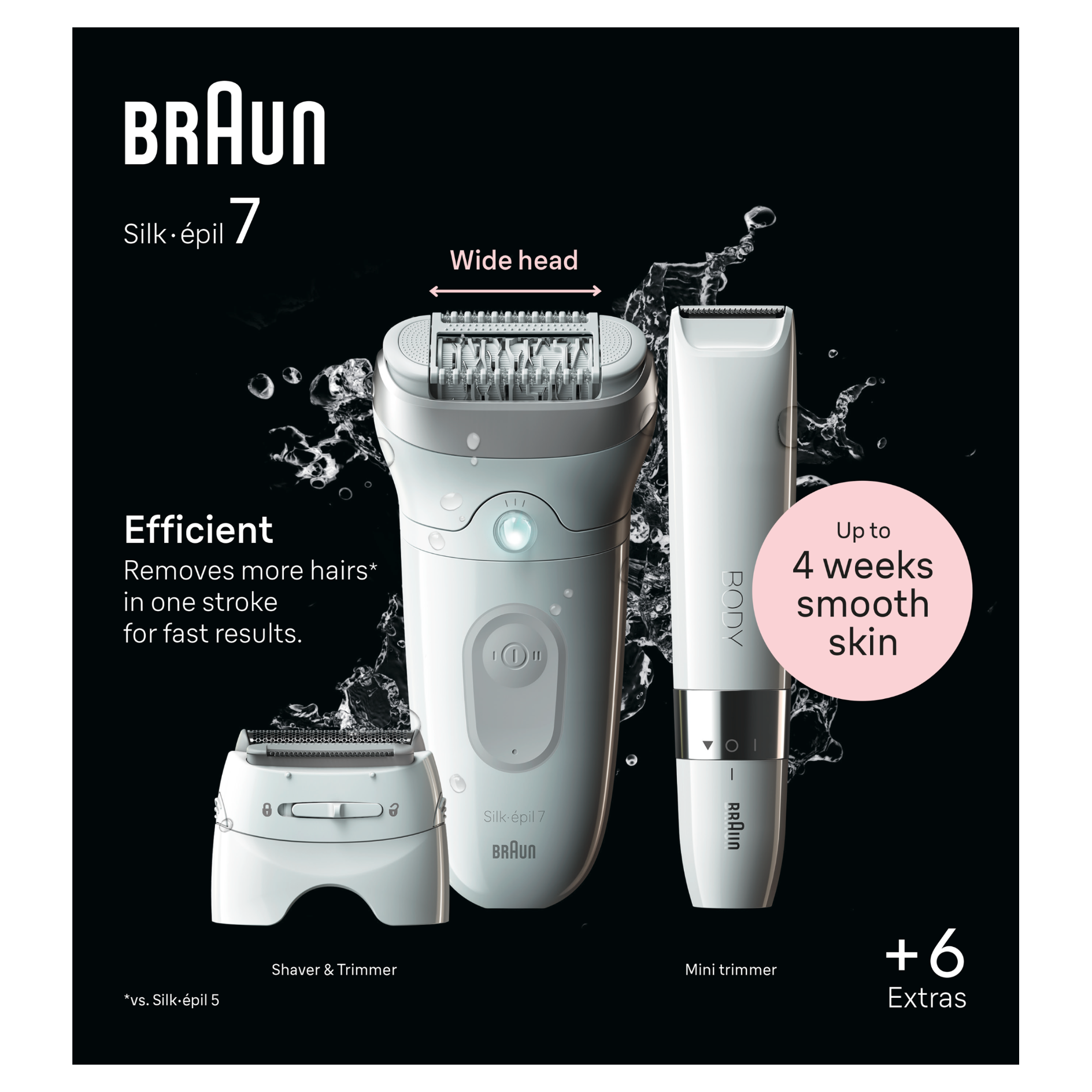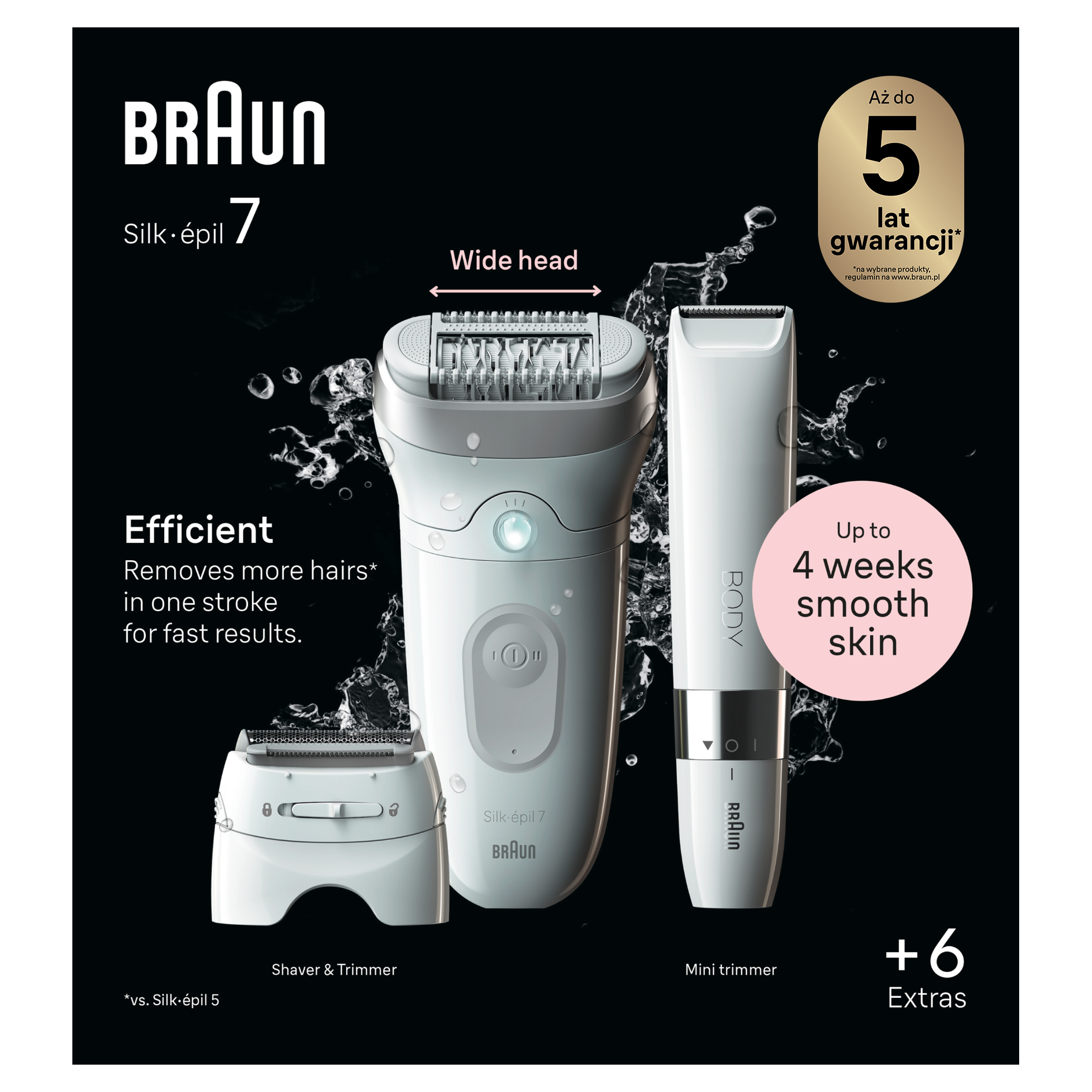 szeroka głowica usuwa więcej (w porównaniu z Braun Silk-épil 5) włosków za jednym pociągnięciem.