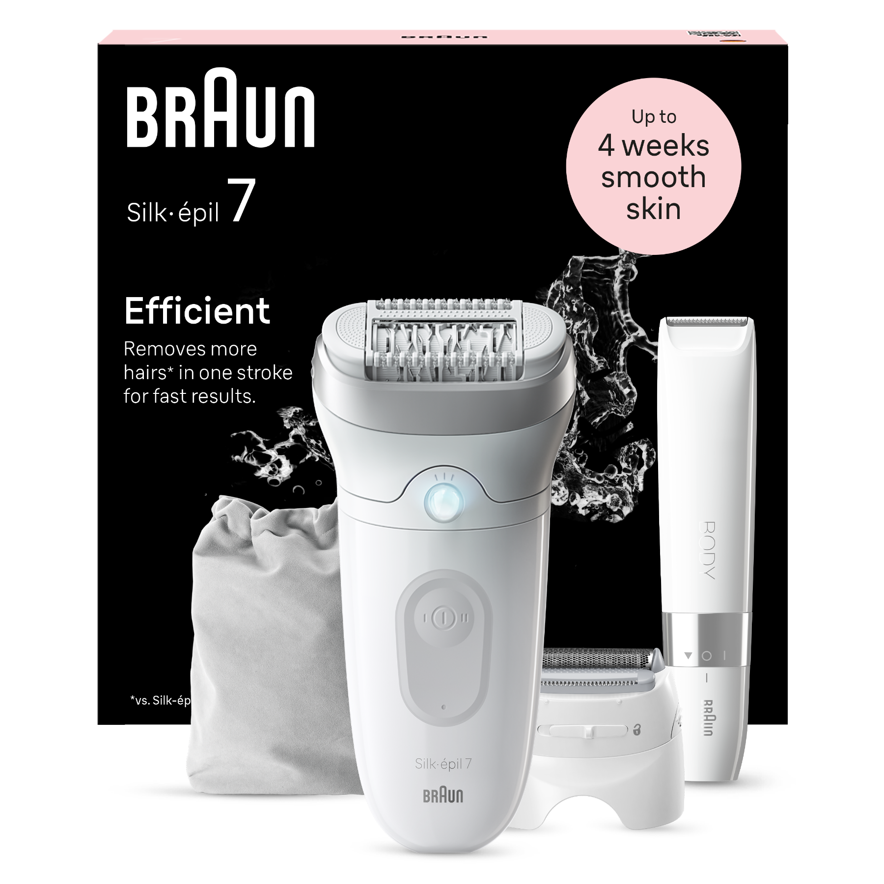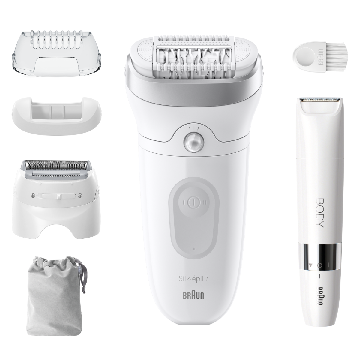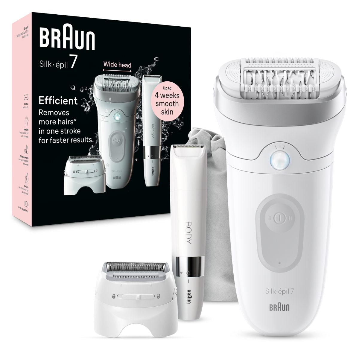 Depilator Braun Silk-épil 7 pozwala uzyskać i utrzymać gładką skórę nawet przez miesiąc. Wyposażony w szeroką głowicę depilator do stosowania na mokro i sucho usuwa włosy z większych obszarów ciała, wychwytując więcej (w porównaniu z Braun Silk-épil 5) włosków za każdym pociągnięciem. Ten bezprzewodowy depilator Braun dysponuje technologią pęset MicroGrip, zdolnych do wychwytywania krótkich włosków o długości zaledwie 0,5 mm.
