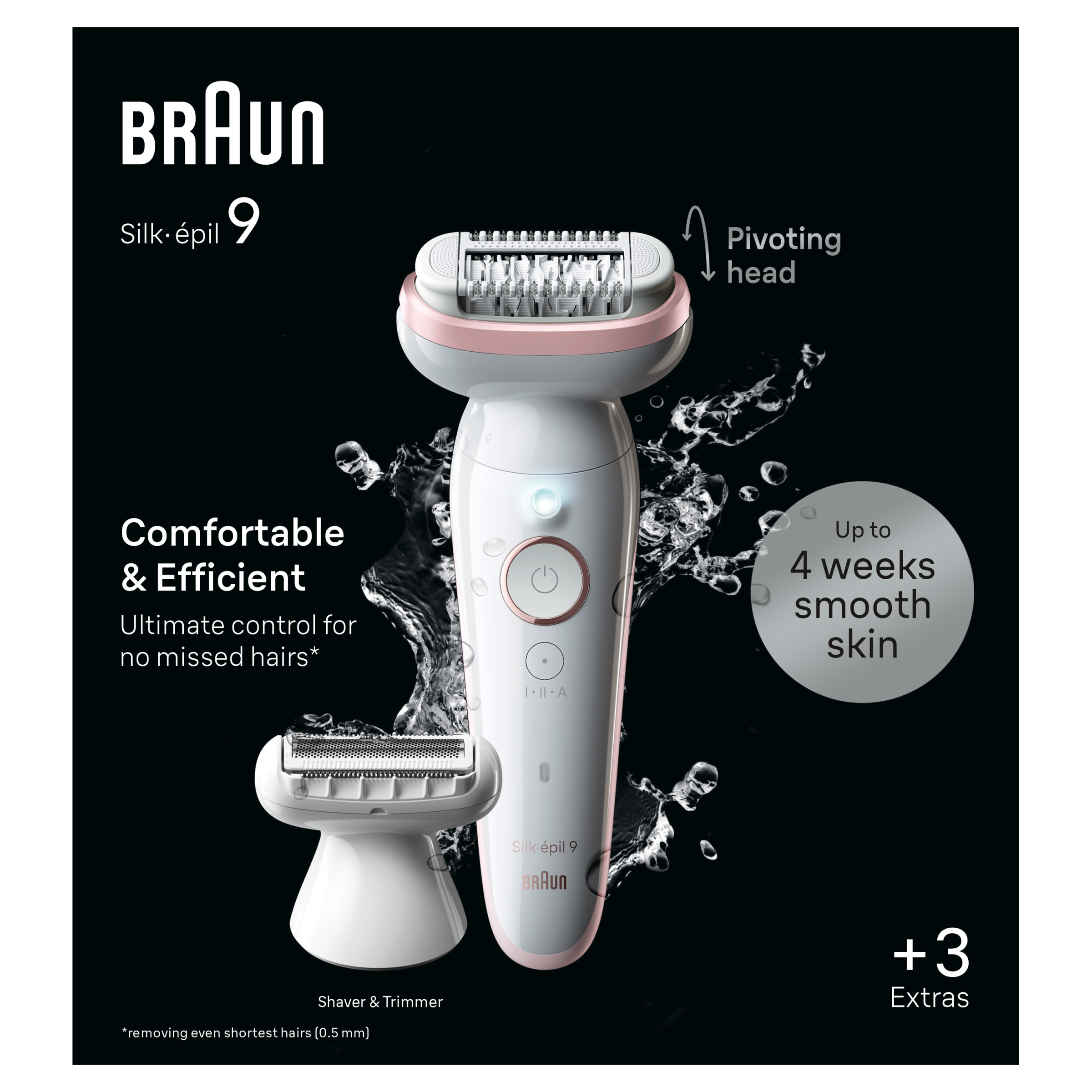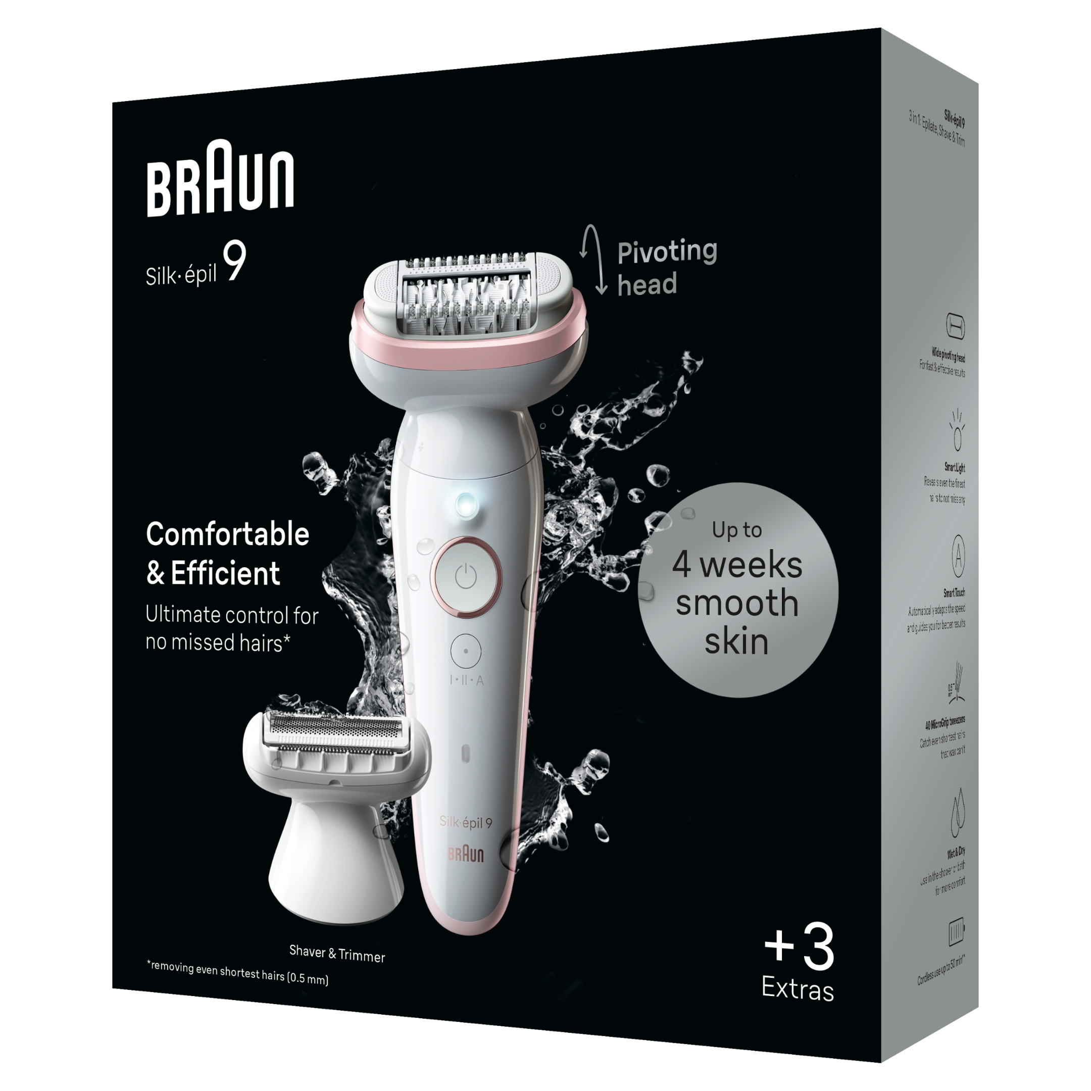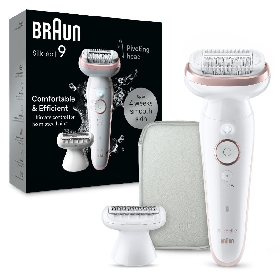 Depilator Braun Silk-épil 9 pozwala uzyskać i utrzymać gładką skórę nawet przez miesiąc. Wyposażony w szeroką głowicę depilator do stosowania na mokro i sucho dostosowuje się do kształtu ciała. Ten bezprzewodowy depilator Braun wyposażono w 40 pęset MicroGrip, które wychwytują włoski o długości zaledwie 0,5 mm, zapewniając gładką skórę przez długi czas.