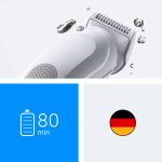 Stworzony, by służyć jak najdłużej: w pełni wodoodporny trymer do ciała wyposażony jest w wydajny akumulator, który zapewnia 80-minutowy czas działania