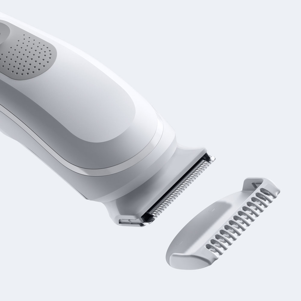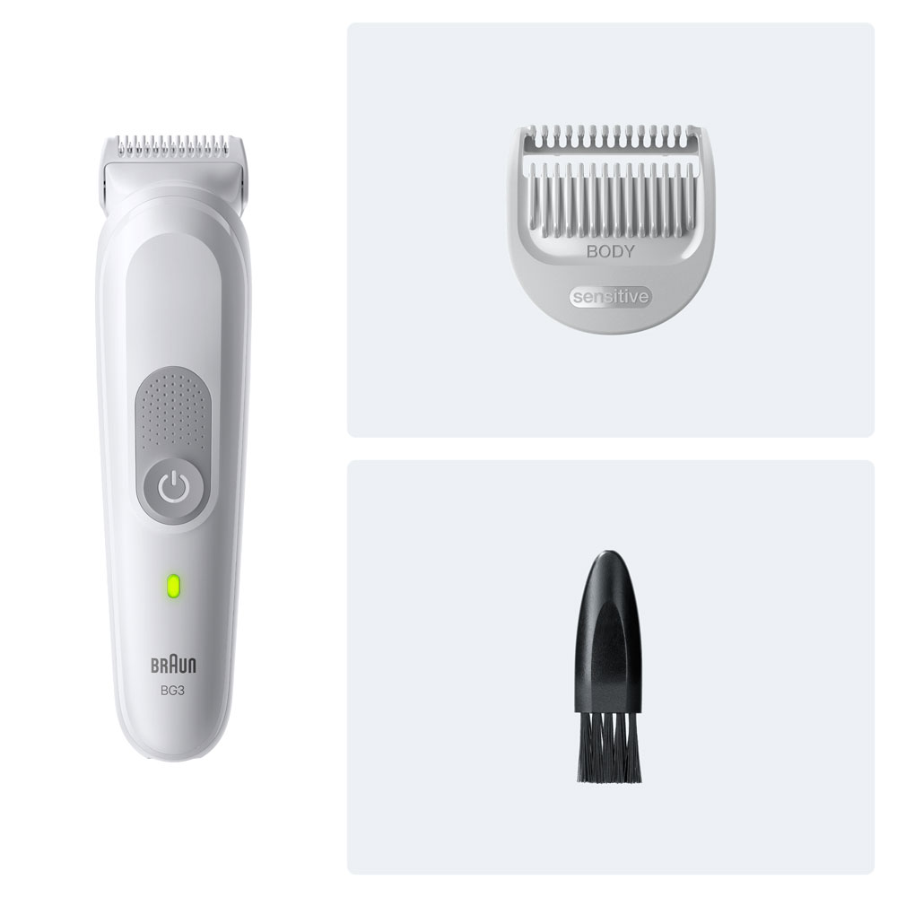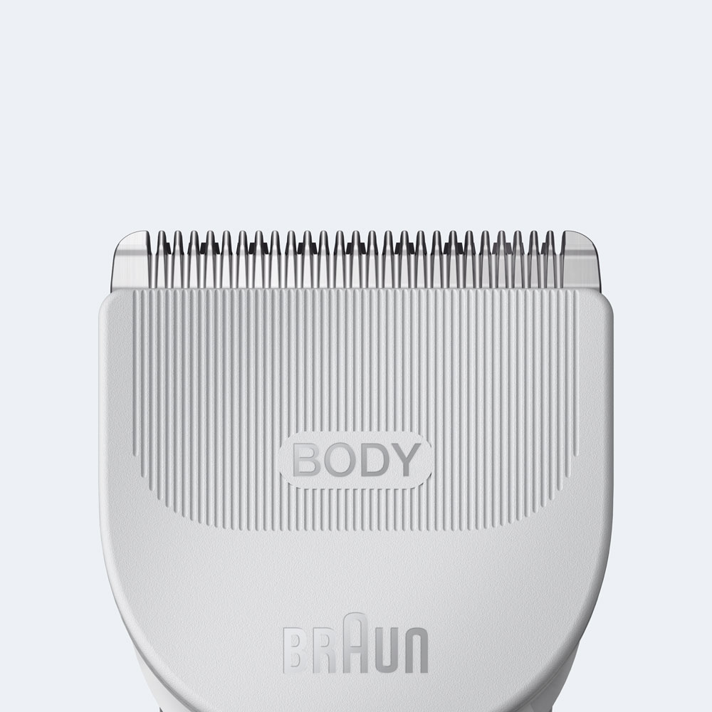 Trymer do ciała posiada zdejmowany grzebień do okolic wrażliwych, który zapewnia bezpieczeństwo i komfort, zapobiegając kontaktowi ostrza ze skórą. Trymer do ciała Series 3 w kolorze jasnoszarym, stworzony, by służyć jak najdłużej, w pełni wodoodporny, z akumulatorem o 80-minutowym czasie działania.