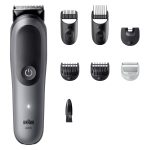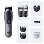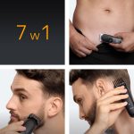 Wszechstronny wielofunkcyjny zestaw do pielęgnacji ciała Braun dla mężczyzn. Zestaw przyrządów 7 w 1 umożliwia łatwe przycinanie brody, włosków w uszach i nosie, strzyżenie włosów i usuwanie owłosienia na całym ciele.