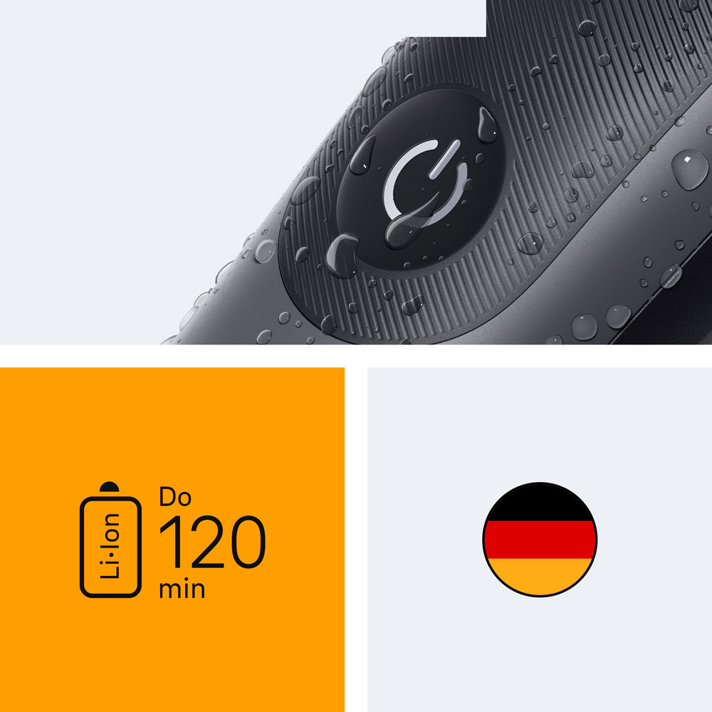 Stworzony po to, by służyć jak najdłużej: W pełni wodoodporny, z technologią AquaGrip, która daje kontrolę nawet pod prysznicem. Trwały akumulator litowo-jonowy zapewnia czas działania bezprzewodowego do 120 minut