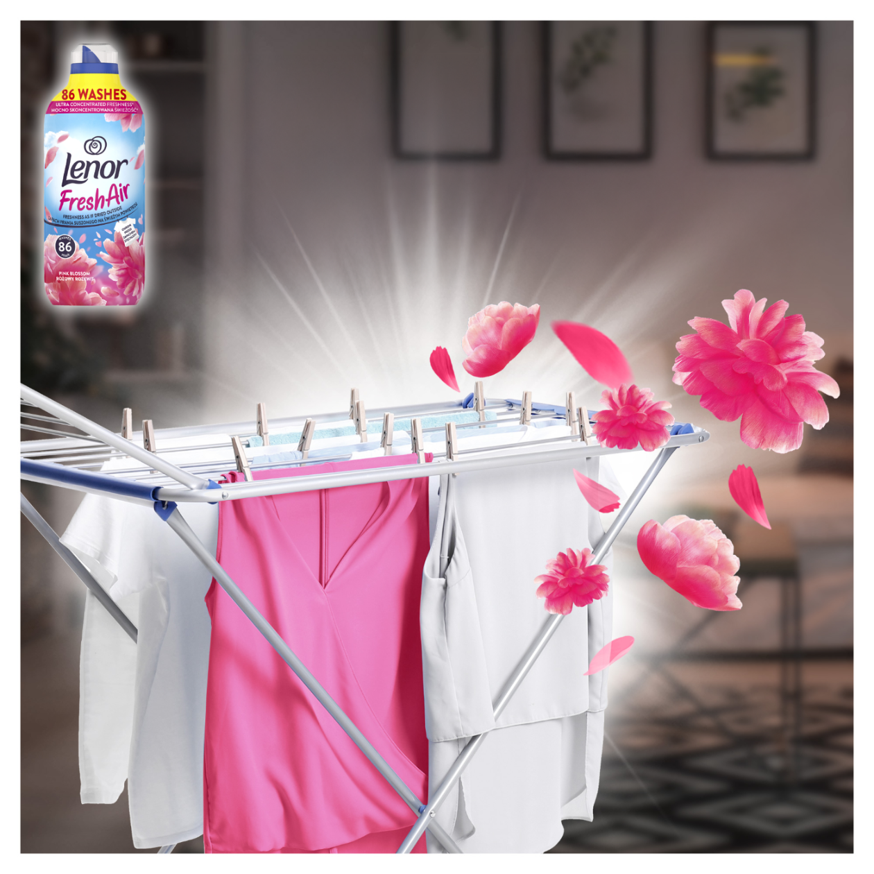 Ciesz się świeżością ubrań suszonych na zewnątrz, nawet jeśli suszysz je w domu! Wysoce skoncentrowana formuła świeżości Lenor Fresh Air jest bardziej skoncentrowana w porównaniu z innymi płynami do płukania Lenor, dzięki czemu mniejsza butelka wystarcza na 86 prań. W połączeniu z ochroną przed przykrym zapachem, płyn do płukania tkanin Lenor Fresh Air Pink Blossom daje uczucie długotrwałej świeżości. Poczuj ten świeży kwiatowy zapach! Połączenie świeżych i łagodnych nut z ochroną przed przykrym zapachem daje uczucie długotrwałej świeżości. Plastikowa butelka z recyklingu, z wyjątkiem nakrętki, końcówki i etykiety. Płyn do płukania tkanin Lenor Fresh Air został opracowany we współpracy z konsumentami, aby odtworzyć efekt świeżości otwartych przestrzeni. Uwalnia świeży zapach po wysuszeniu tkanin, podczas ich przechowywania w szafie, a nawet podczas ich noszenia. Plastikowa butelka z recyklingu, z wyjątkiem nakrętki, końcówki i etykiety.