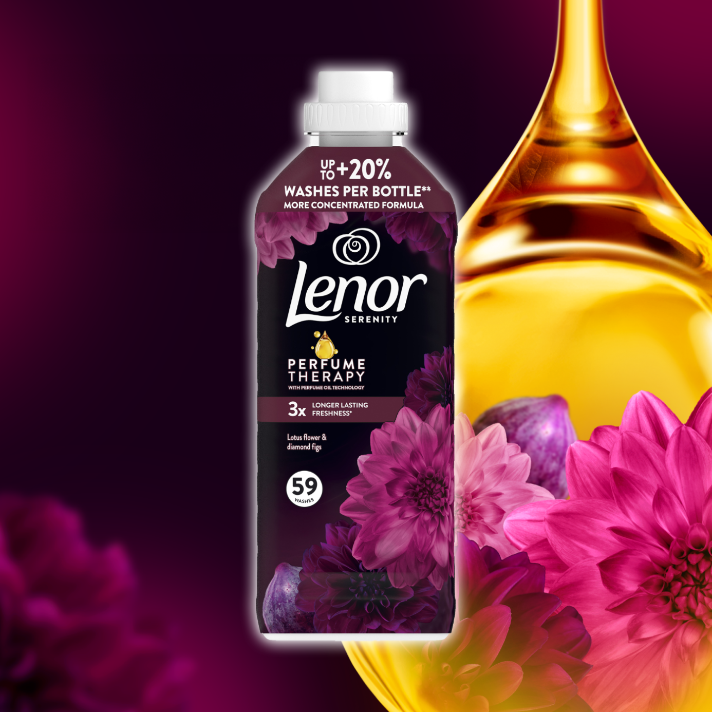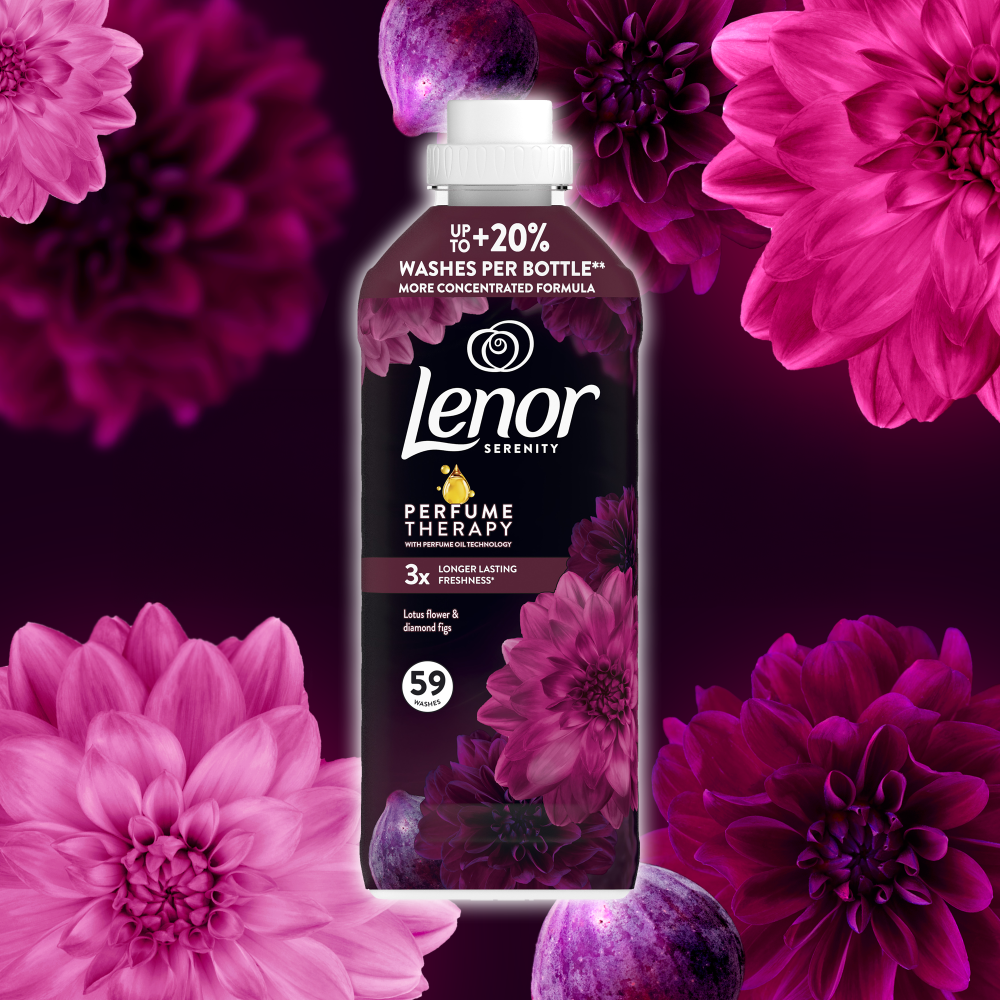 Płyn do płukania tkanin Lenor Lotus Water & Diamond Figs zapewnia 3 razy dłużej utrzymujący się zapach (w porównaniu z Lenor Sensitive) i odrobinę relaksu przez cały dzień. Jego kompozycja zapachowa zawiera odrobinę olejków eterycznych. Zamknij oczy i zrelaksuj się. Wyrafinowane, wprawiające w stan relaksu nuty kwiatu lotosu i fig uspokajają myśli.