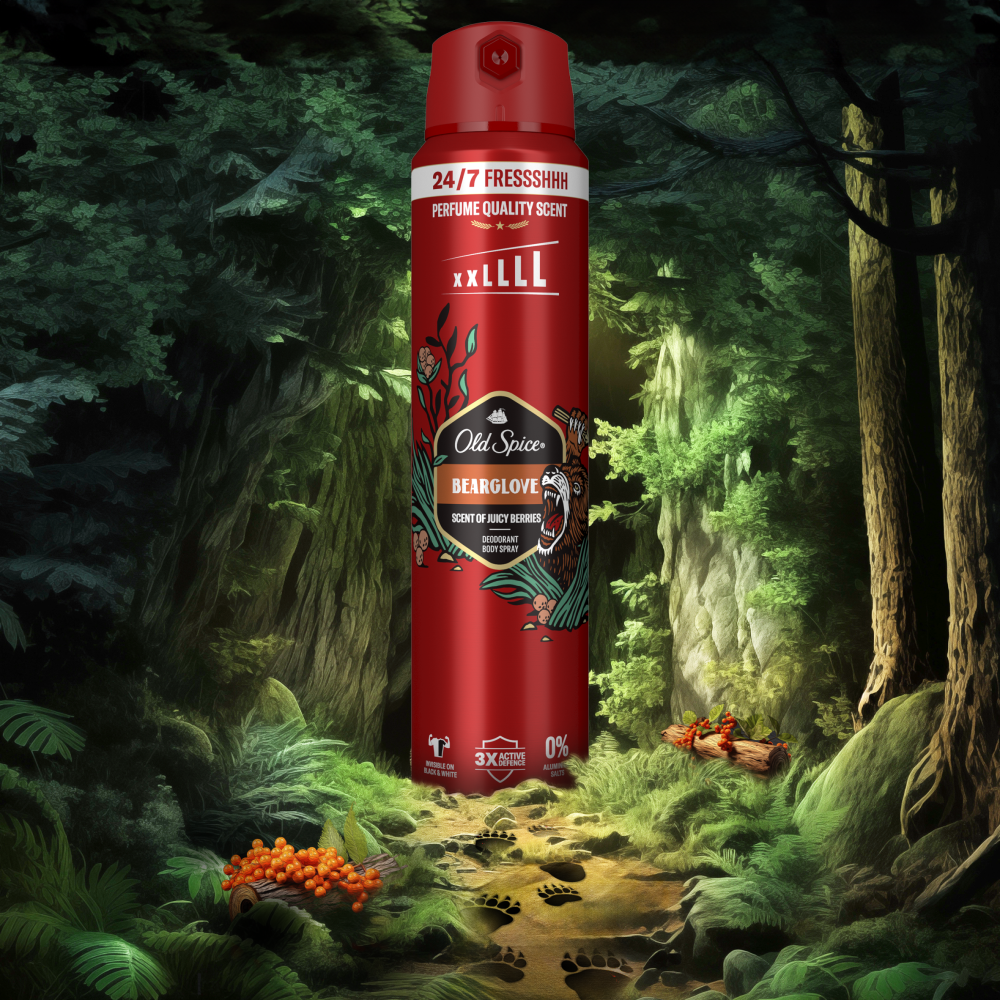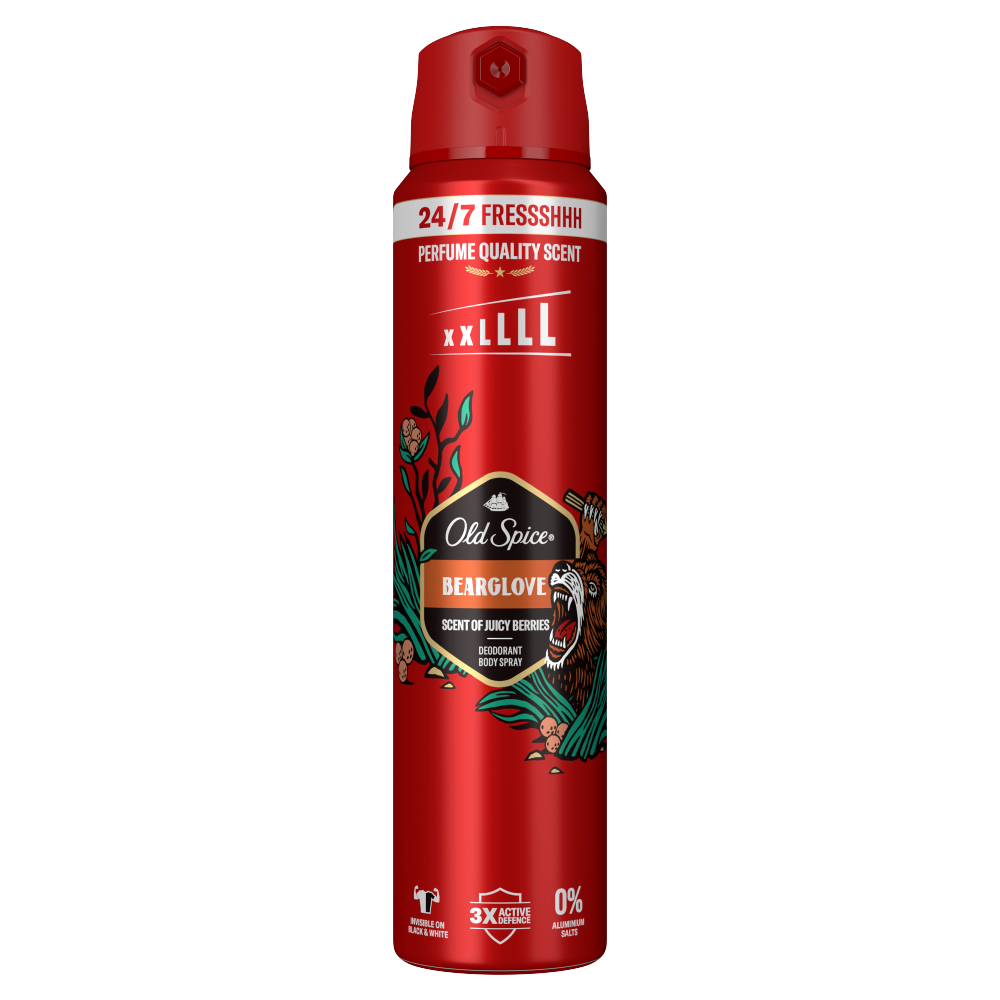 Ciesz się świeżością przez 24 godziny i 7 dni w tygodniu* oraz pachnącą pewnością siebie dzięki dezodorantowi Old Spice Bearglove w sprayu. Z tym poziomem beztroskiej świeżości możesz skupić się na poważniejszych zadaniach, jak finalizacja transakcji czy uczenie delfinów ludzkiej mowy.