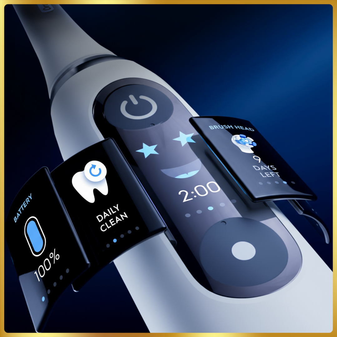 INTERAKTYWNY WYŚWIETLACZ SZCZOTECZKI, który monitoruje czas szczotkowania i siłę nacisku, a także przypomina, kiedy należy wymienić końcówkę szczoteczki, pomagając uzyskać DOSKONAŁĄ CZYSTOŚĆ