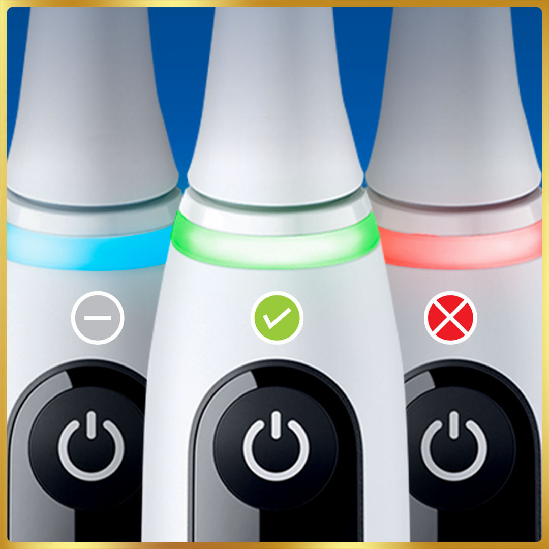 WIZUALNY CZUJNIK SIŁY NACISKU zapewniający zdrowsze zęby i dziąsła: sygnalizuje, czy szczotkujesz zęby ZBYT MOCNO, ZBYT DELIKATNIE, czy PRAWIDŁOWO