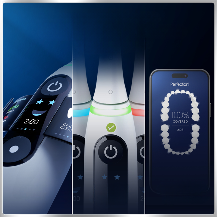 INTERAKTYWNY WYŚWIETLACZ SZCZOTECZKI, który monitoruje czas szczotkowania i siłę nacisku, a także przypomina, kiedy należy wymienić końcówkę szczoteczki, pomagając uzyskać DOSKONAŁĄ CZYSTOŚĆ